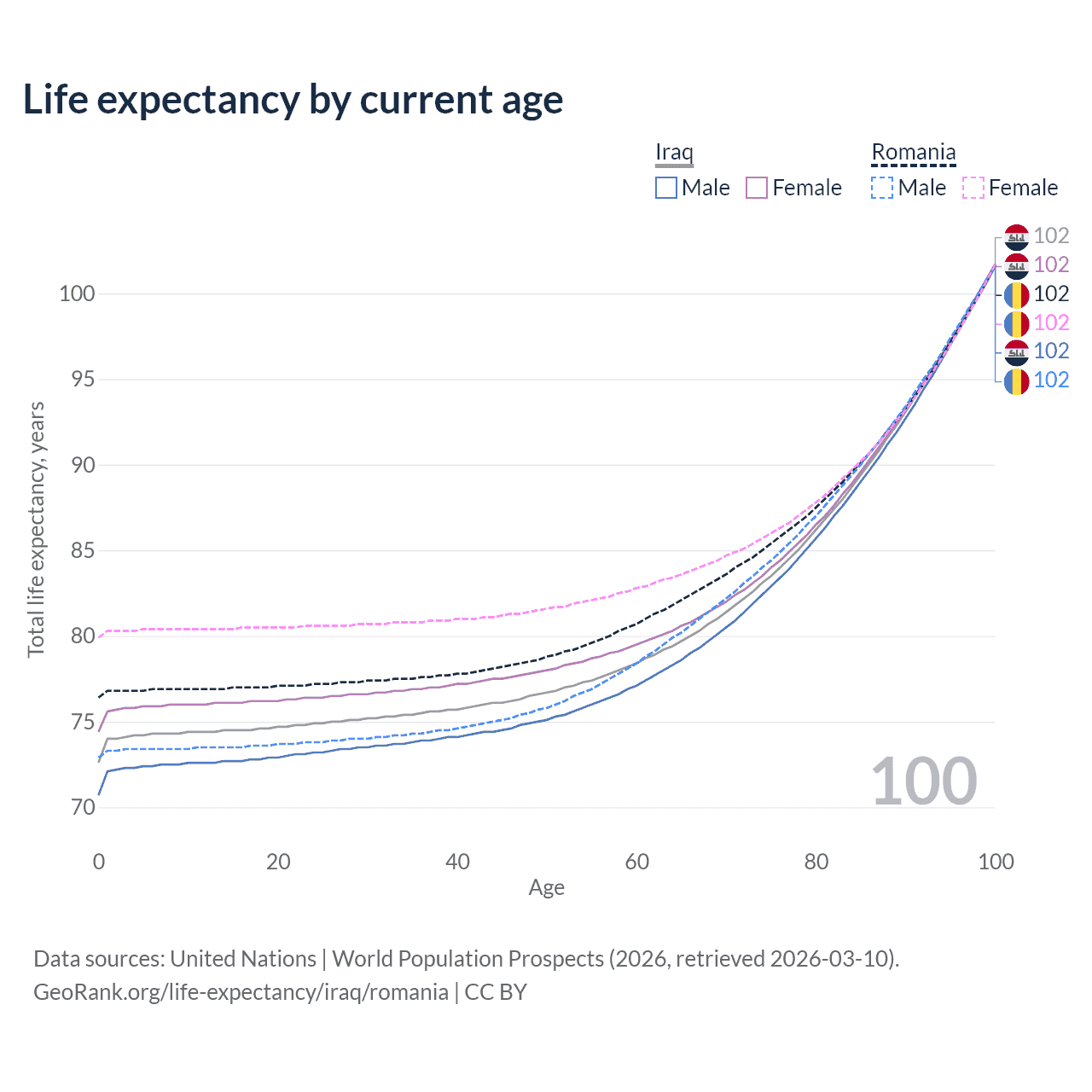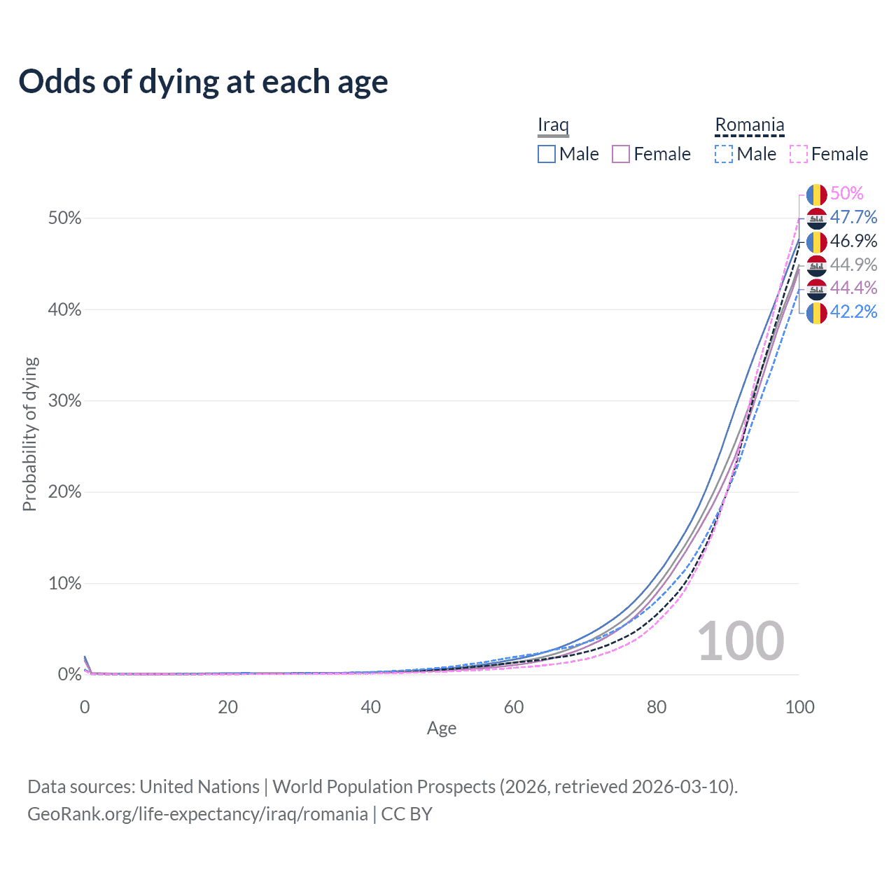 This life expectancy calculator shows the odds of living to 100, 95, 90, and below based on current age for both males and females in Iraq and Romania, along with mean and median age of death. The calculations are based on the 2026 life tables (actuarial tables) from the UN World Population Prospects.