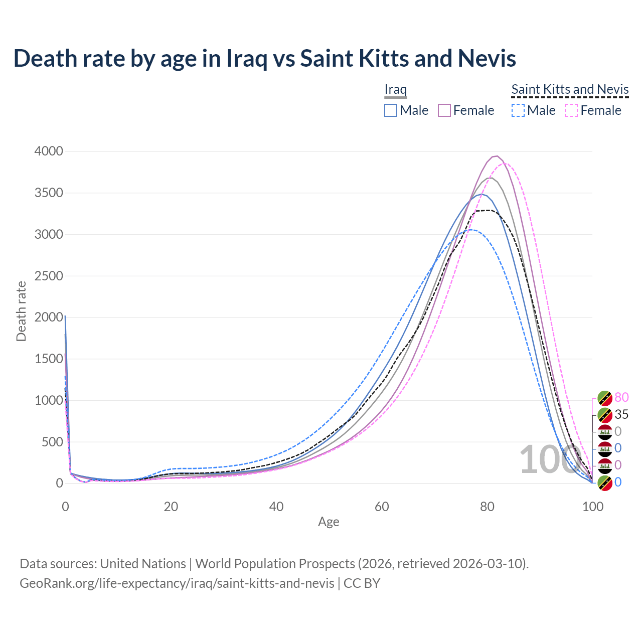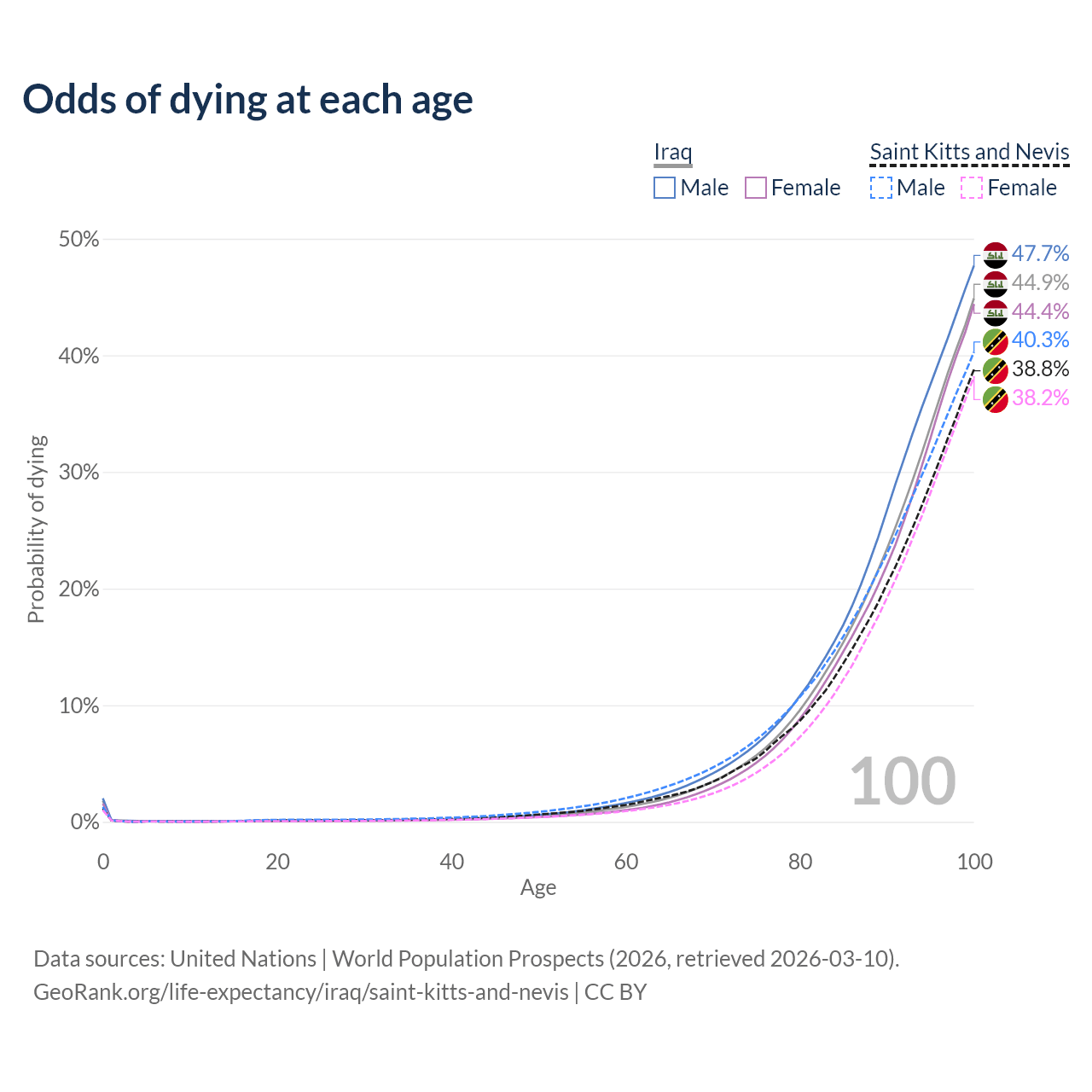 This life expectancy calculator shows the odds of living to 100, 95, 90, and below based on current age for both males and females in Iraq and Saint Kitts and Nevis, along with mean and median age of death. The calculations are based on the 2026 life tables (actuarial tables) from the UN World Population Prospects.