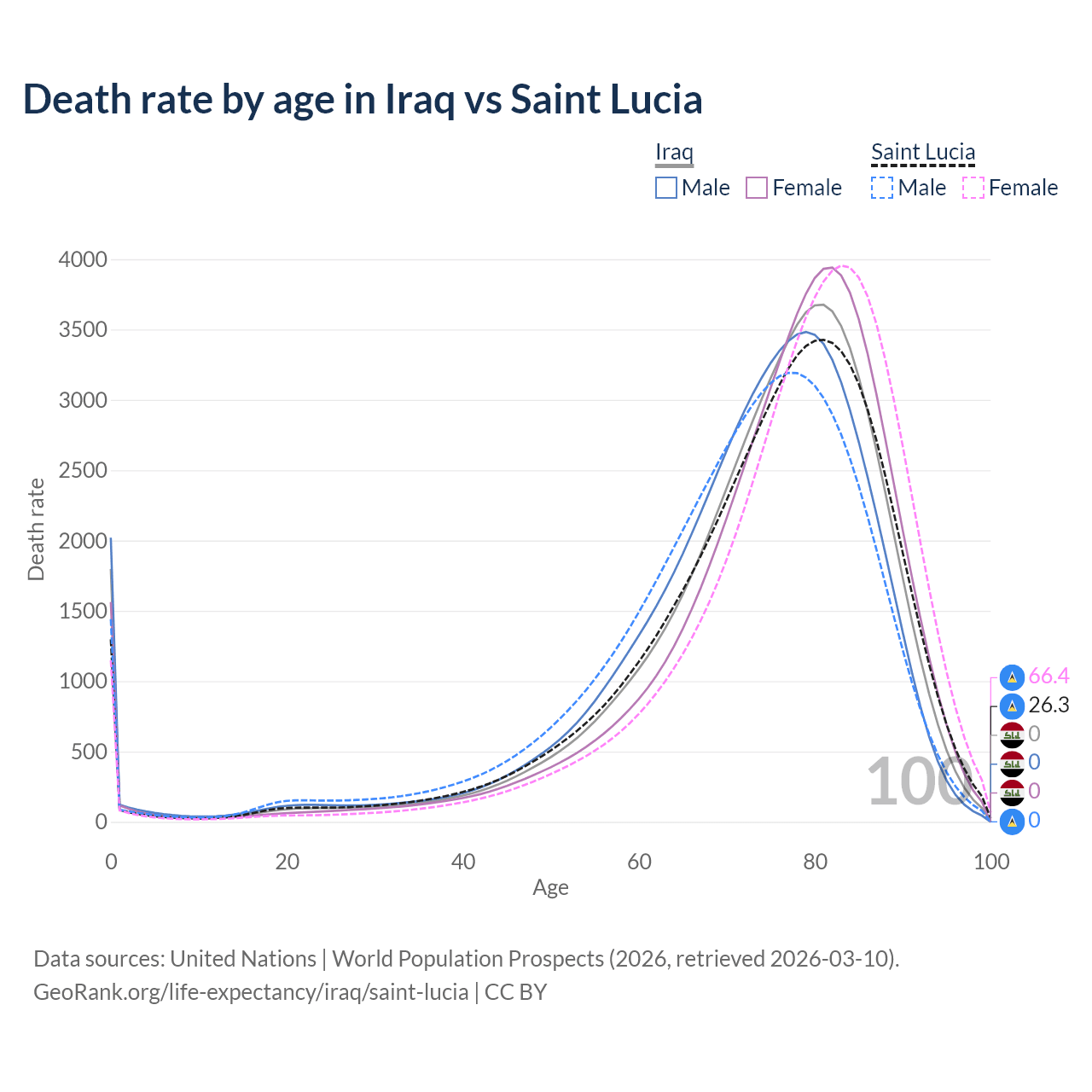 This life expectancy calculator shows the odds of living to 100, 95, 90, and below based on current age for both males and females in Iraq and Saint Lucia, along with mean and median age of death. The calculations are based on the 2026 life tables (actuarial tables) from the UN World Population Prospects.