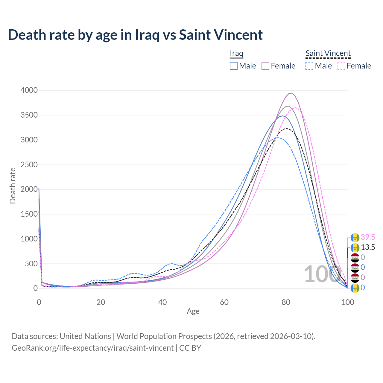 In Iraq, the most common age of death is 81, compared to 80 in Saint Vincent. The median age of death is 76.7 in Iraq and 75.6 in Saint Vincent, meaning only half of each cohort is expected to live past that age.