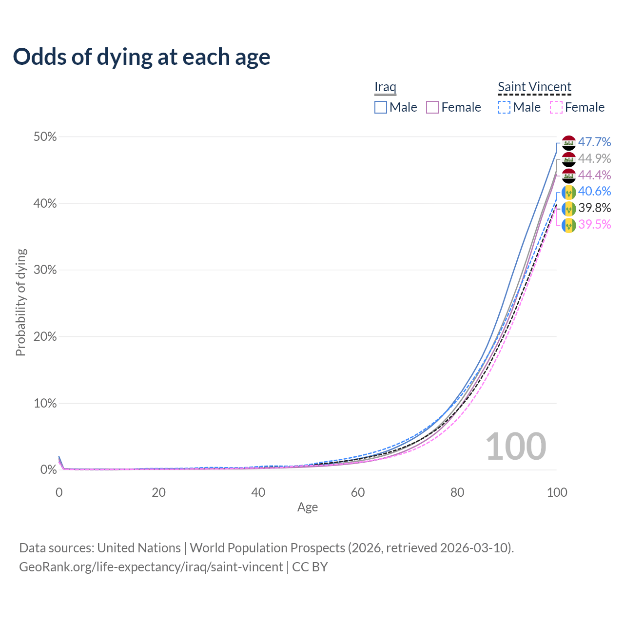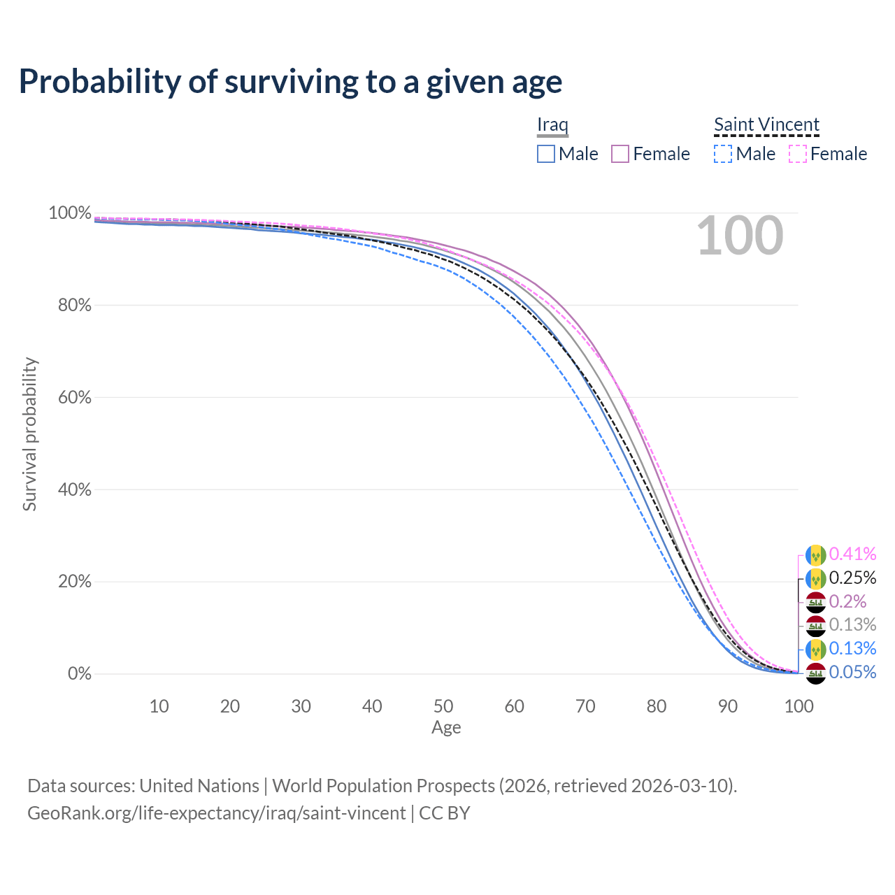 This life expectancy calculator shows the odds of living to 100, 95, 90, and below based on current age for both males and females in Iraq and Saint Vincent, along with mean and median age of death. The calculations are based on the 2026 life tables (actuarial tables) from the UN World Population Prospects.
