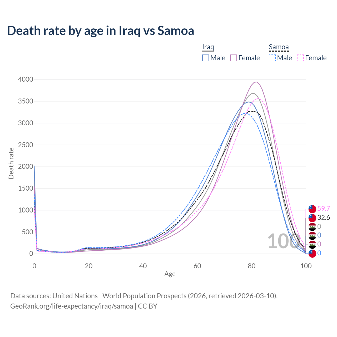 In Iraq, the most common age of death is 81, compared to 80 in Samoa. The median age of death is 76.7 in Iraq and 75.9 in Samoa, meaning only half of each cohort is expected to live past that age.