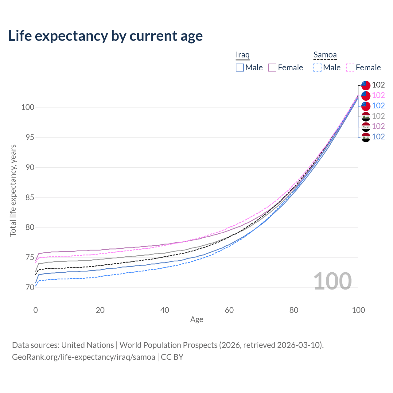 This life expectancy calculator shows the odds of living to 100, 95, 90, and below based on current age for both males and females in Iraq and Samoa, along with mean and median age of death. The calculations are based on the 2026 life tables (actuarial tables) from the UN World Population Prospects.