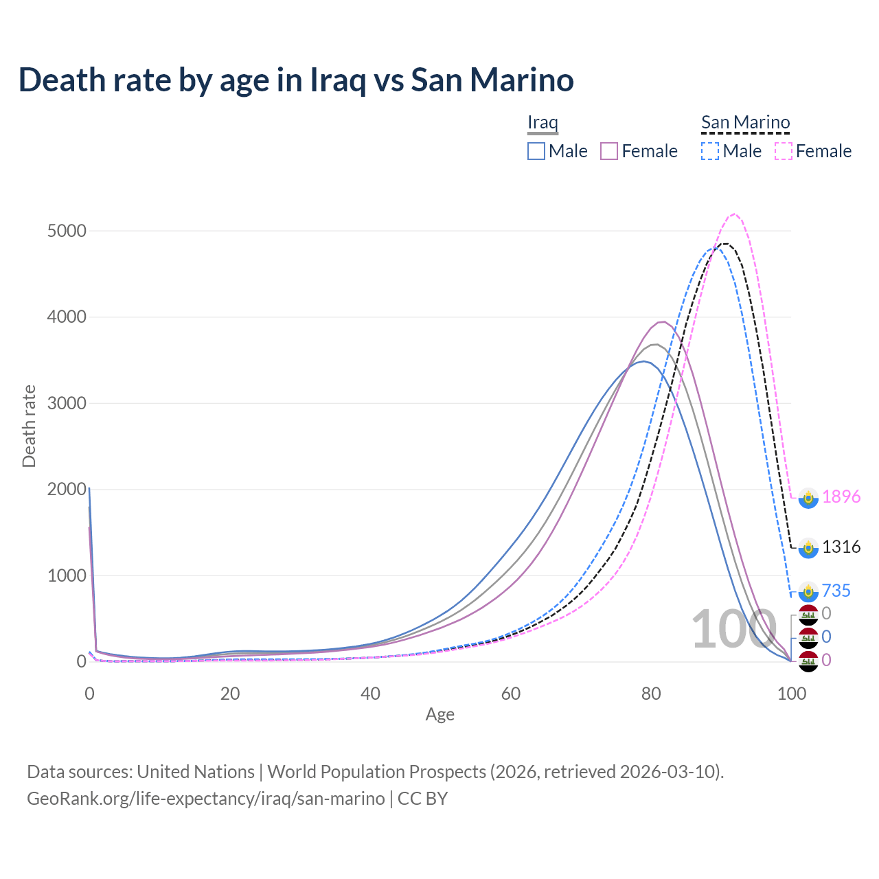 In Iraq, the most common age of death is 81, compared to 91 in San Marino. The median age of death is 76.7 in Iraq and 88.3 in San Marino, meaning only half of each cohort is expected to live past that age.