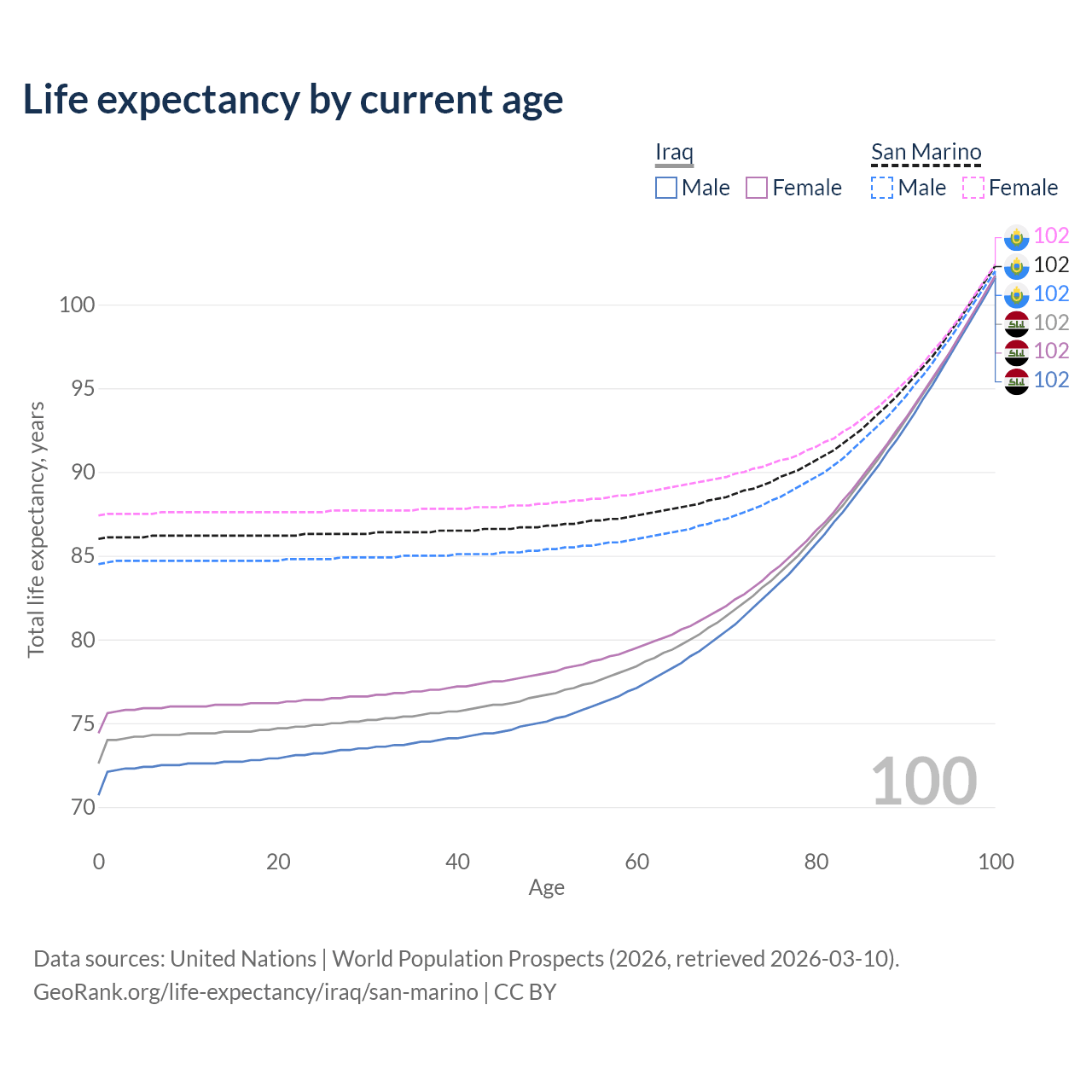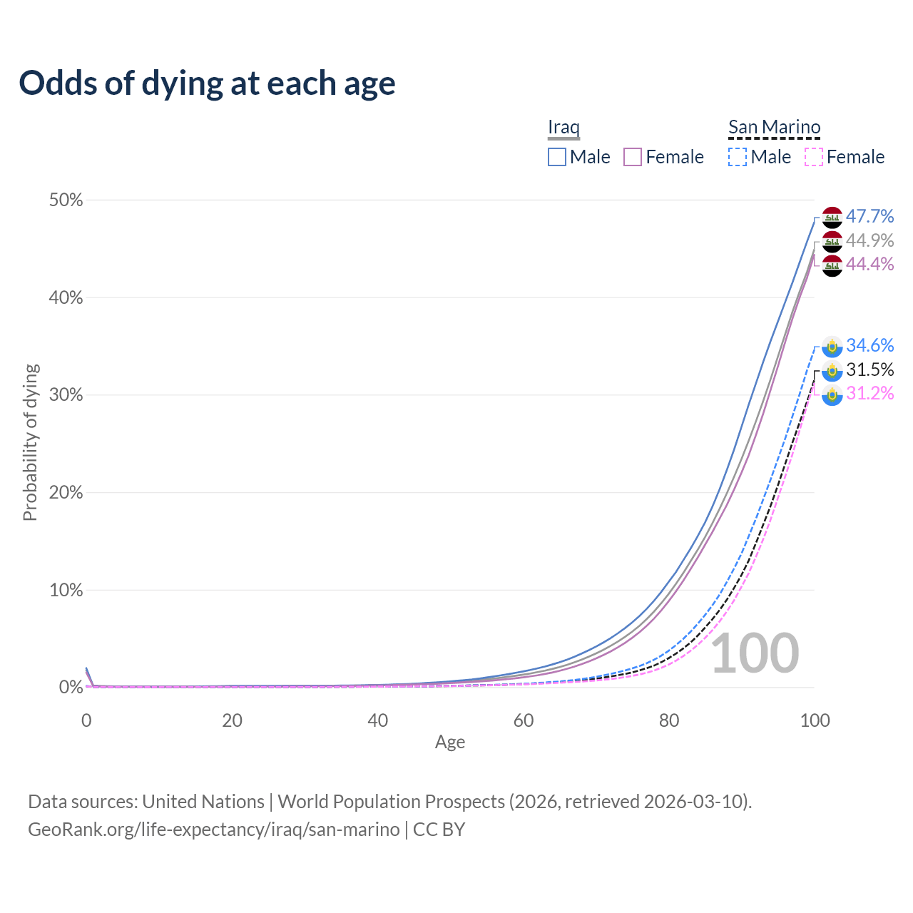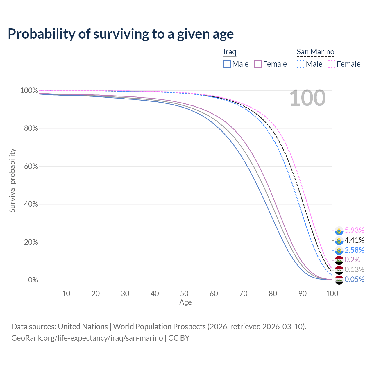 This life expectancy calculator shows the odds of living to 100, 95, 90, and below based on current age for both males and females in Iraq and San Marino, along with mean and median age of death. The calculations are based on the 2026 life tables (actuarial tables) from the UN World Population Prospects.