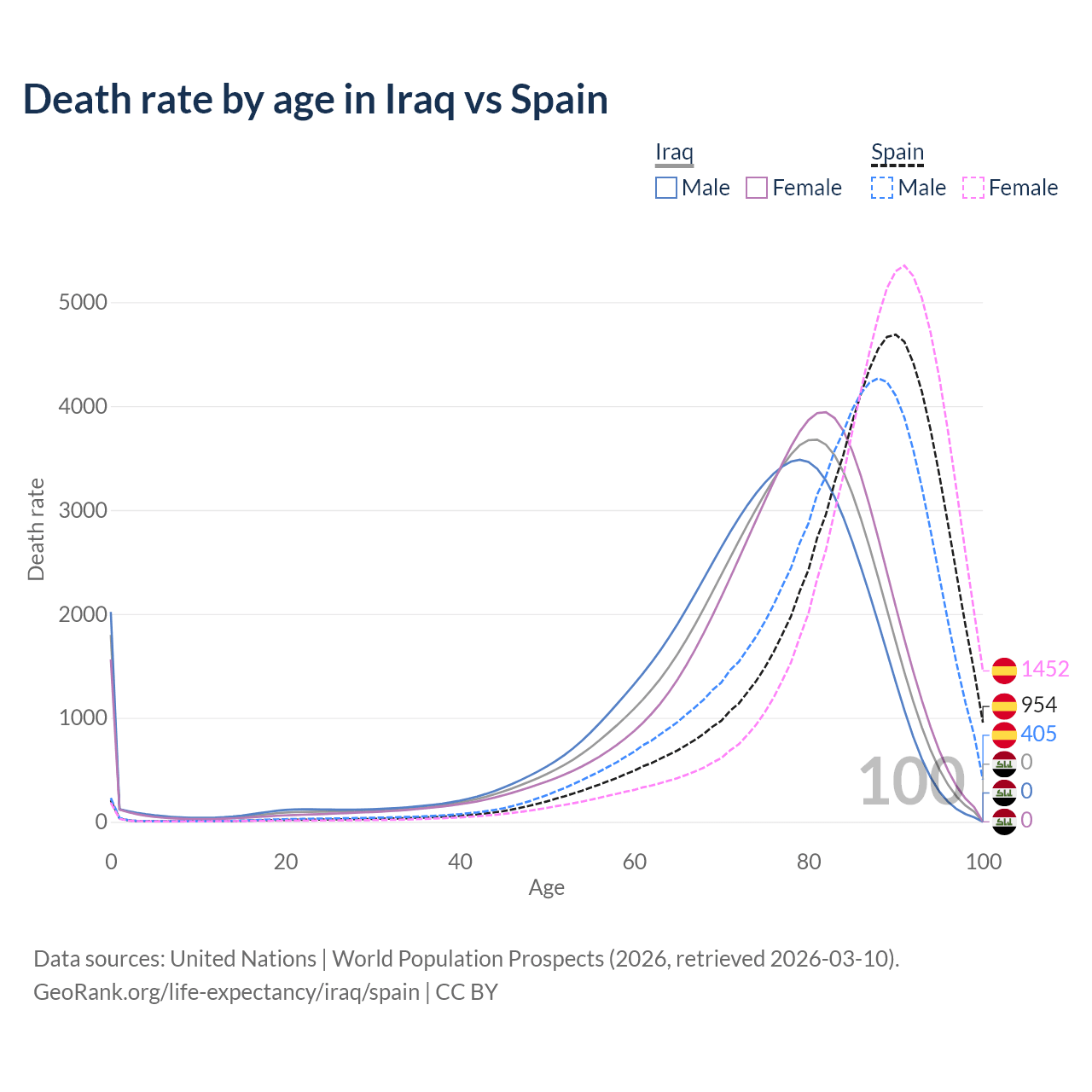 In Iraq, the most common age of death is 81, compared to 90 in Spain. The median age of death is 76.7 in Iraq and 87 in Spain, meaning only half of each cohort is expected to live past that age.