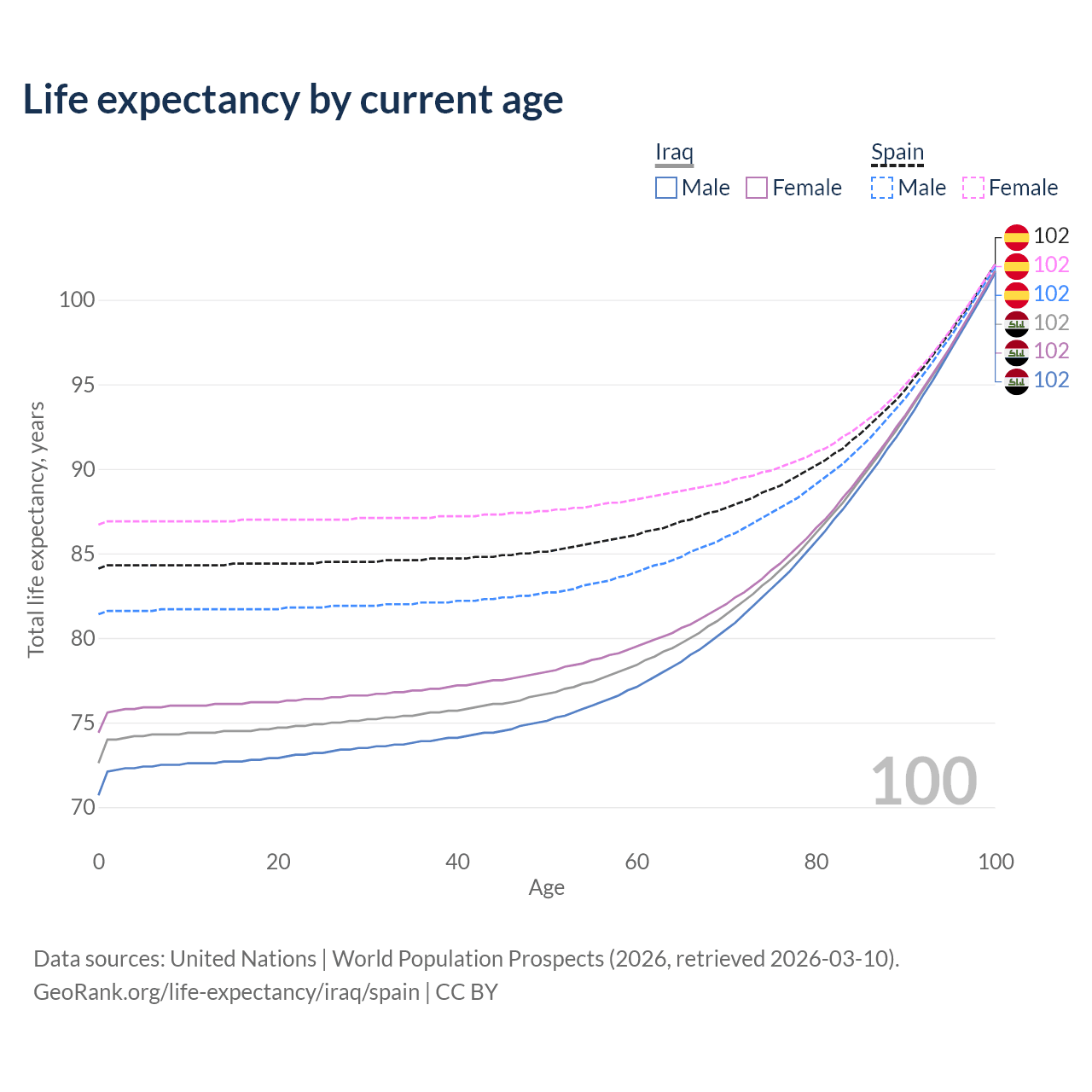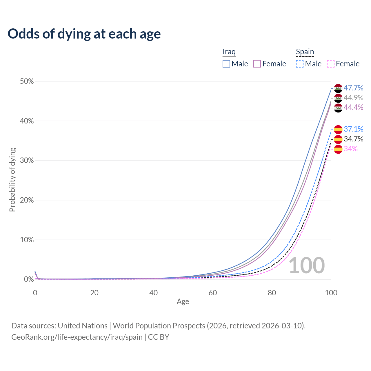 This life expectancy calculator shows the odds of living to 100, 95, 90, and below based on current age for both males and females in Iraq and Spain, along with mean and median age of death. The calculations are based on the 2026 life tables (actuarial tables) from the UN World Population Prospects.