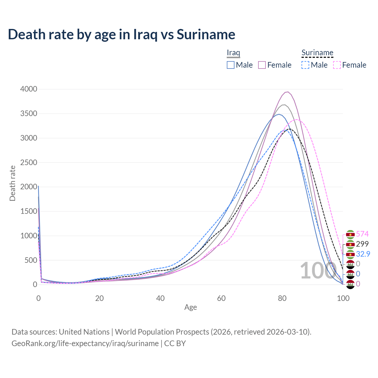 In Iraq, the most common age of death is 81, compared to 82 in Suriname. The median age of death is 76.7 in Iraq and 78 in Suriname, meaning only half of each cohort is expected to live past that age.