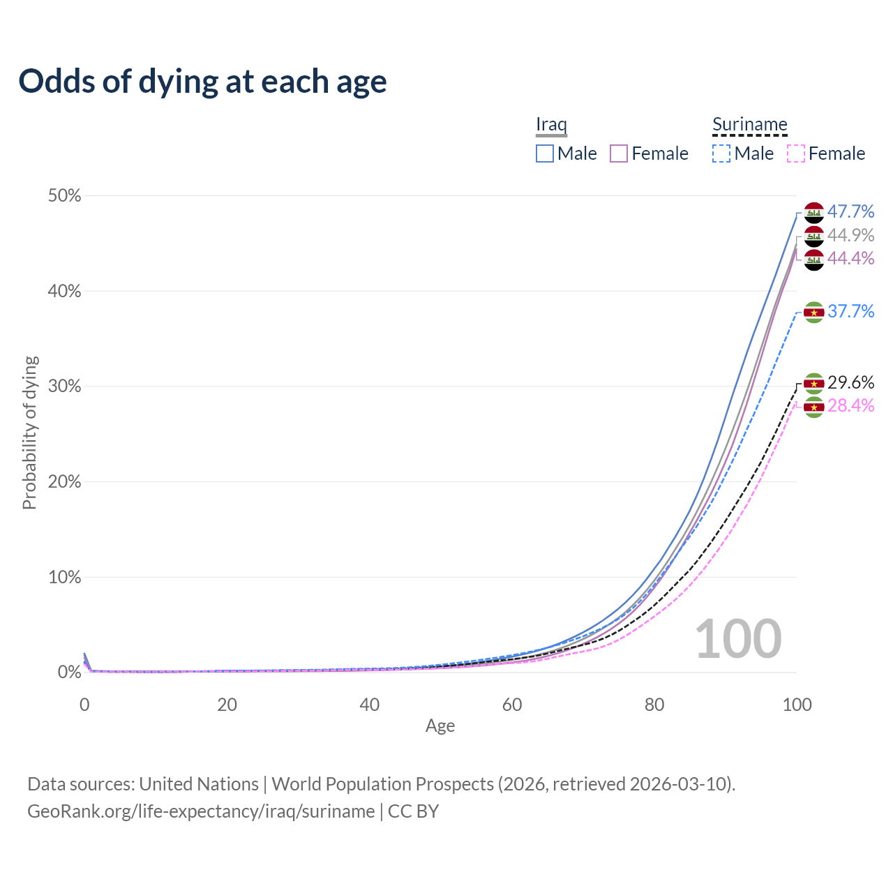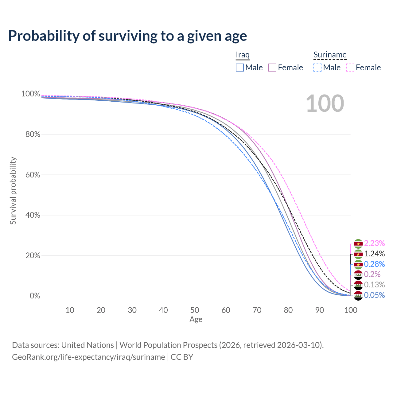 This life expectancy calculator shows the odds of living to 100, 95, 90, and below based on current age for both males and females in Iraq and Suriname, along with mean and median age of death. The calculations are based on the 2026 life tables (actuarial tables) from the UN World Population Prospects.