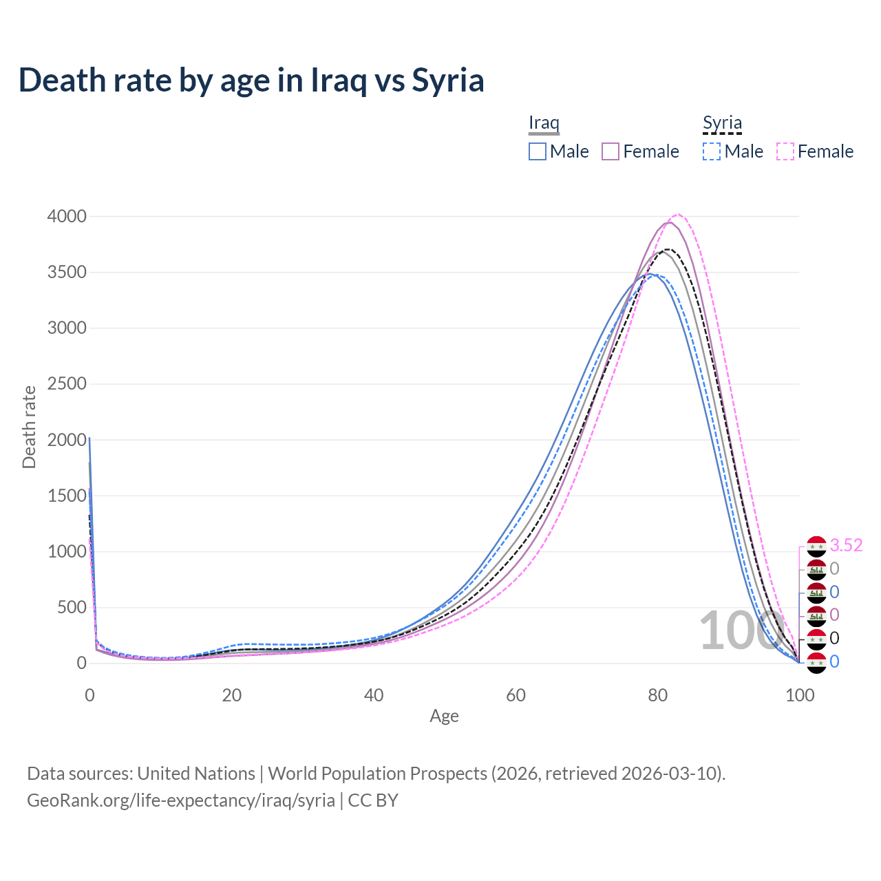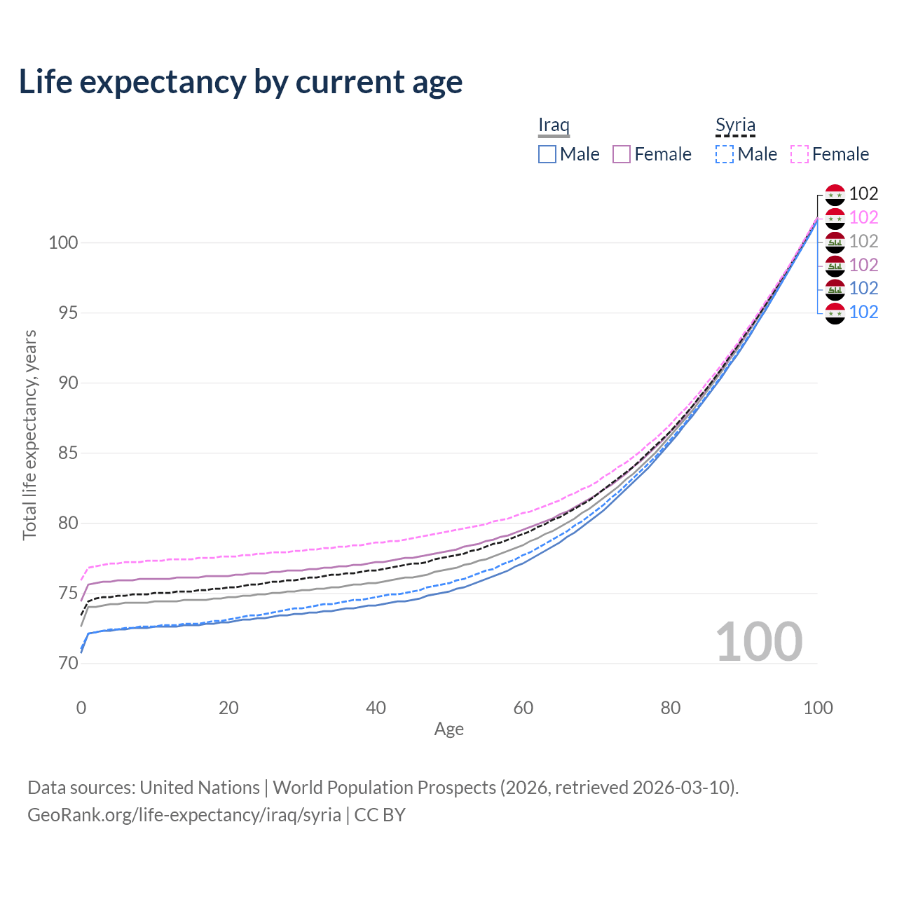 This life expectancy calculator shows the odds of living to 100, 95, 90, and below based on current age for both males and females in Iraq and Syria, along with mean and median age of death. The calculations are based on the 2026 life tables (actuarial tables) from the UN World Population Prospects.