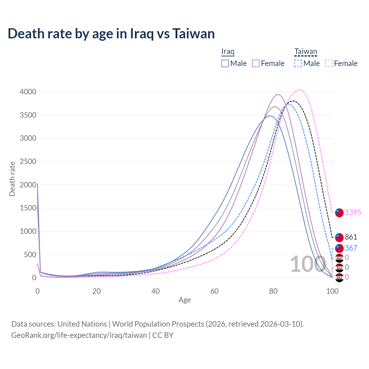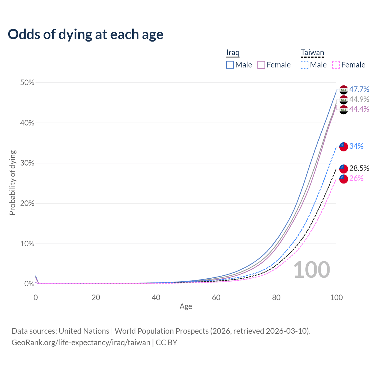 This life expectancy calculator shows the odds of living to 100, 95, 90, and below based on current age for both males and females in Iraq and Taiwan, along with mean and median age of death. The calculations are based on the 2026 life tables (actuarial tables) from the UN World Population Prospects.