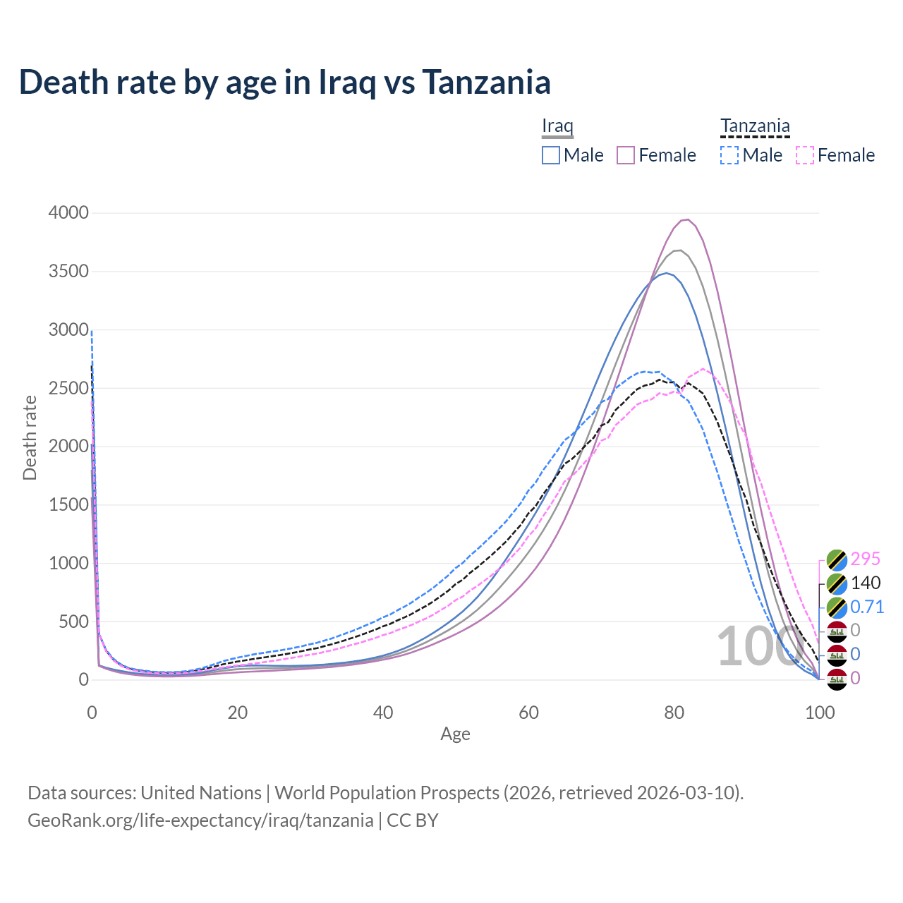 In Iraq, the most common age of death is 81, compared to 0 in Tanzania. The median age of death is 76.7 in Iraq and 72.6 in Tanzania, meaning only half of each cohort is expected to live past that age.