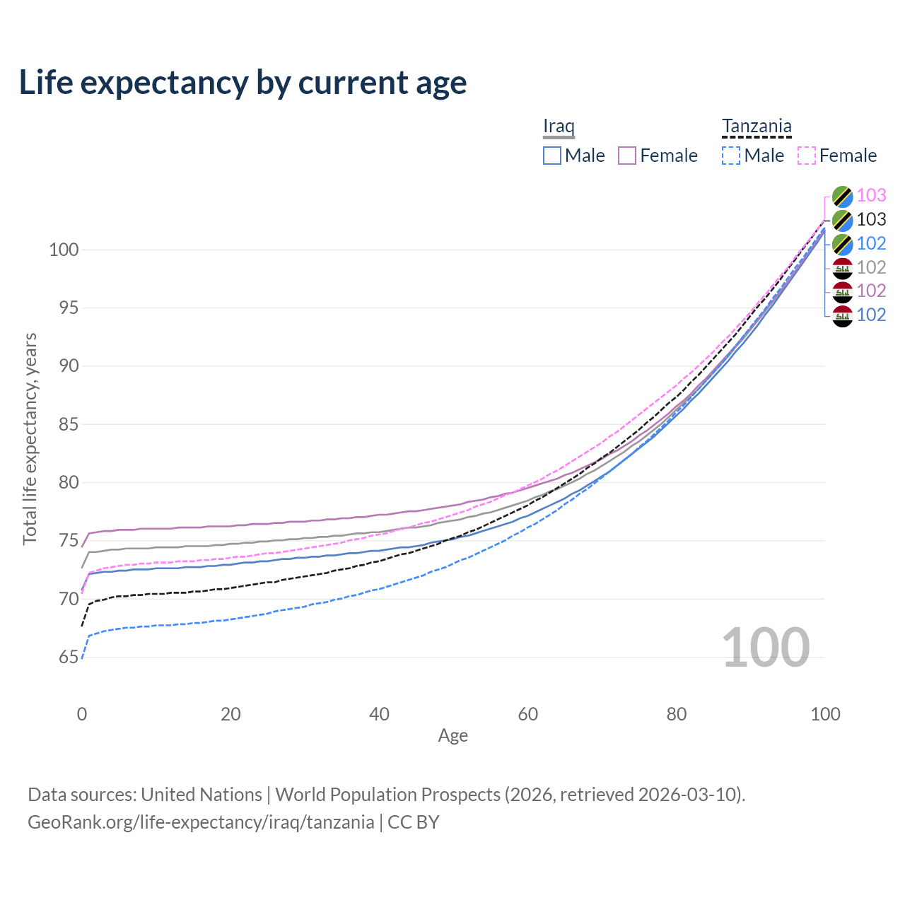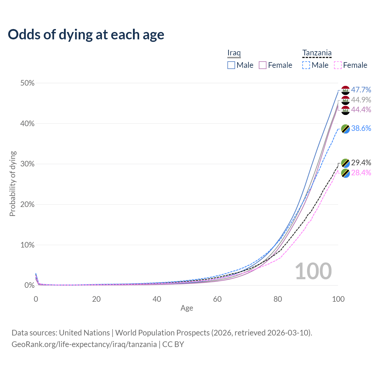 This life expectancy calculator shows the odds of living to 100, 95, 90, and below based on current age for both males and females in Iraq and Tanzania, along with mean and median age of death. The calculations are based on the 2026 life tables (actuarial tables) from the UN World Population Prospects.