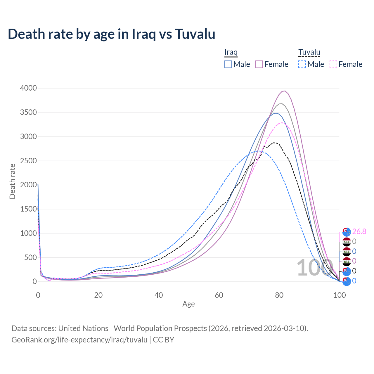 In Iraq, the most common age of death is 81, compared to 78 in Tuvalu. The median age of death is 76.7 in Iraq and 71.9 in Tuvalu, meaning only half of each cohort is expected to live past that age.