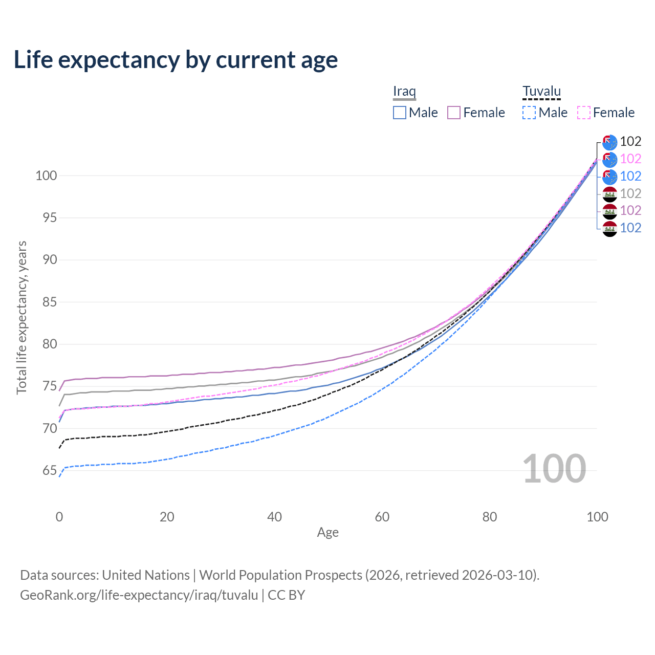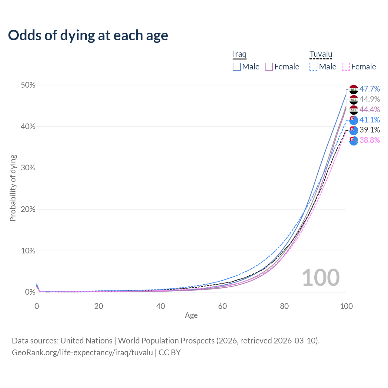 This life expectancy calculator shows the odds of living to 100, 95, 90, and below based on current age for both males and females in Iraq and Tuvalu, along with mean and median age of death. The calculations are based on the 2026 life tables (actuarial tables) from the UN World Population Prospects.