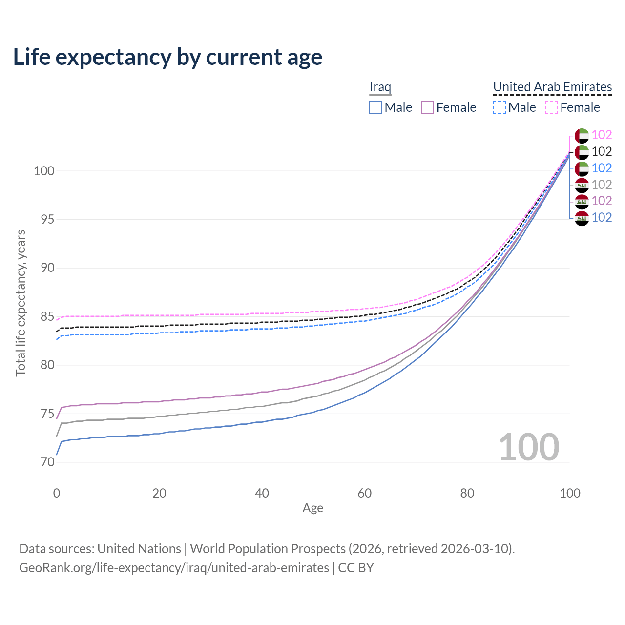 This life expectancy calculator shows the odds of living to 100, 95, 90, and below based on current age for both males and females in Iraq and the United Arab Emirates, along with mean and median age of death. The calculations are based on the 2026 life tables (actuarial tables) from the UN World Population Prospects.