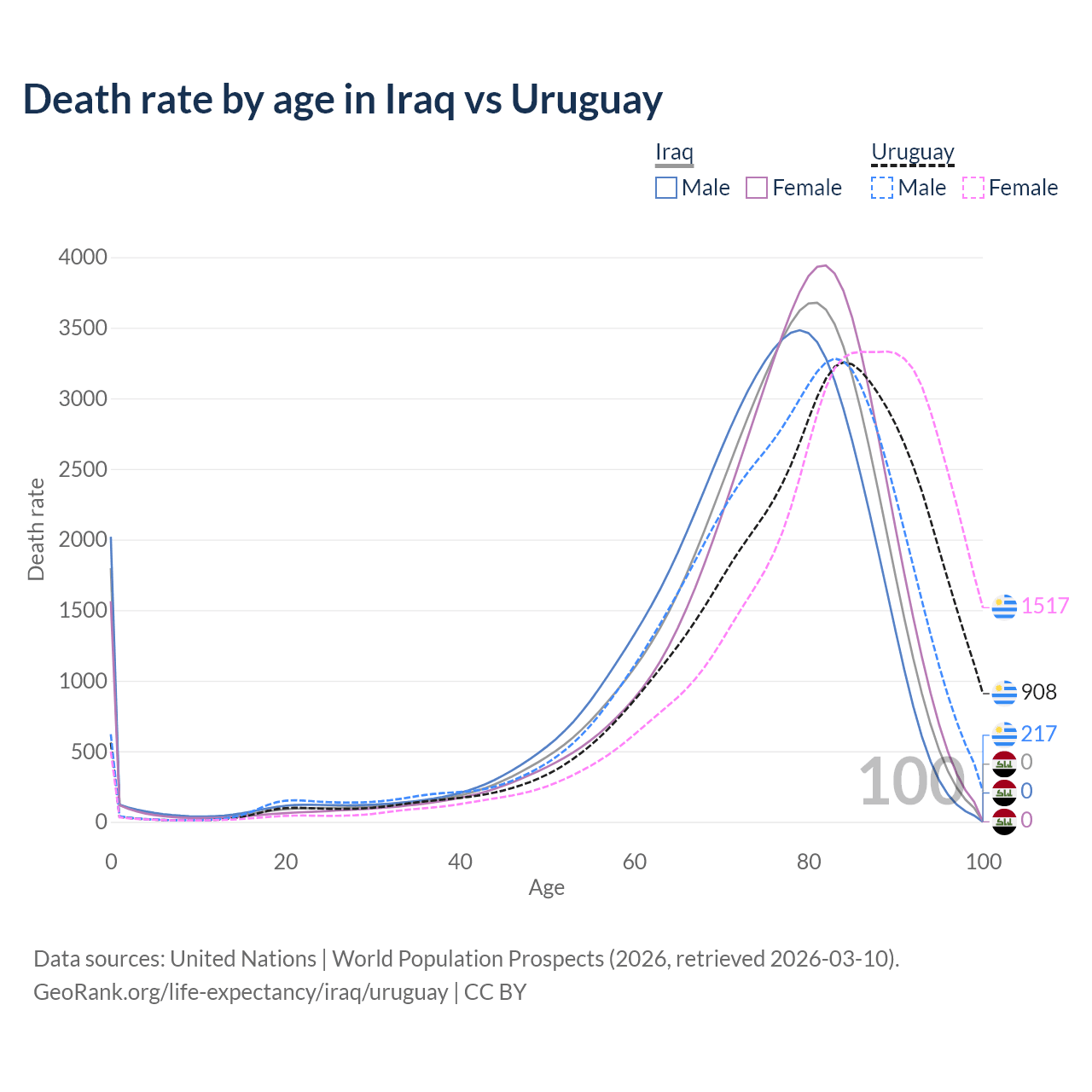 In Iraq, the most common age of death is 81, compared to 84 in Uruguay. The median age of death is 76.7 in Iraq and 81.8 in Uruguay, meaning only half of each cohort is expected to live past that age.