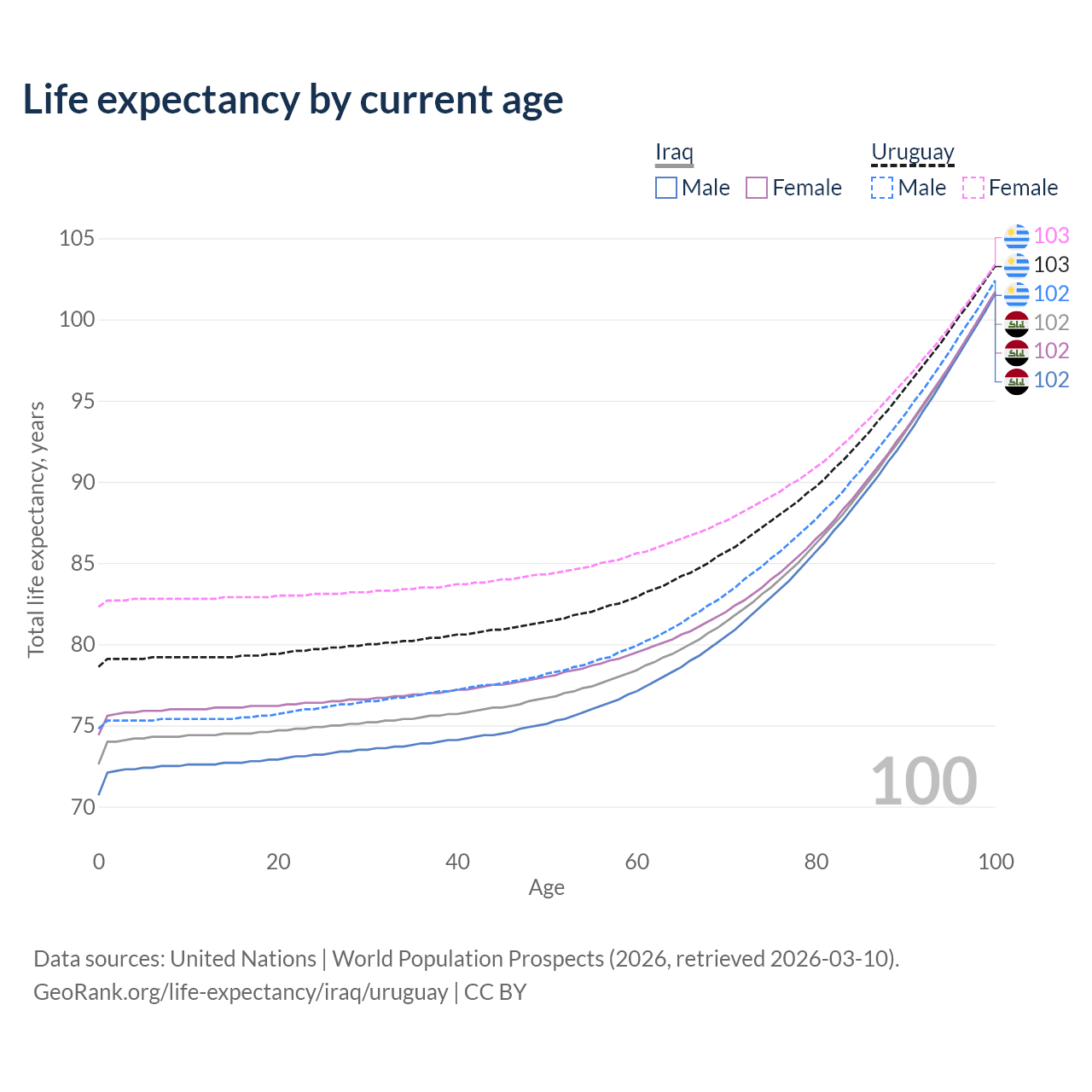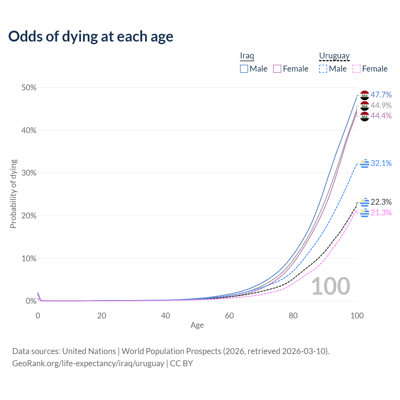 This life expectancy calculator shows the odds of living to 100, 95, 90, and below based on current age for both males and females in Iraq and Uruguay, along with mean and median age of death. The calculations are based on the 2026 life tables (actuarial tables) from the UN World Population Prospects.
