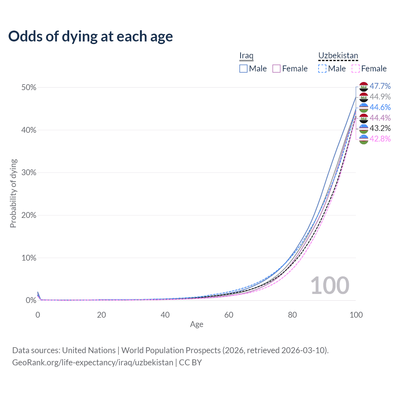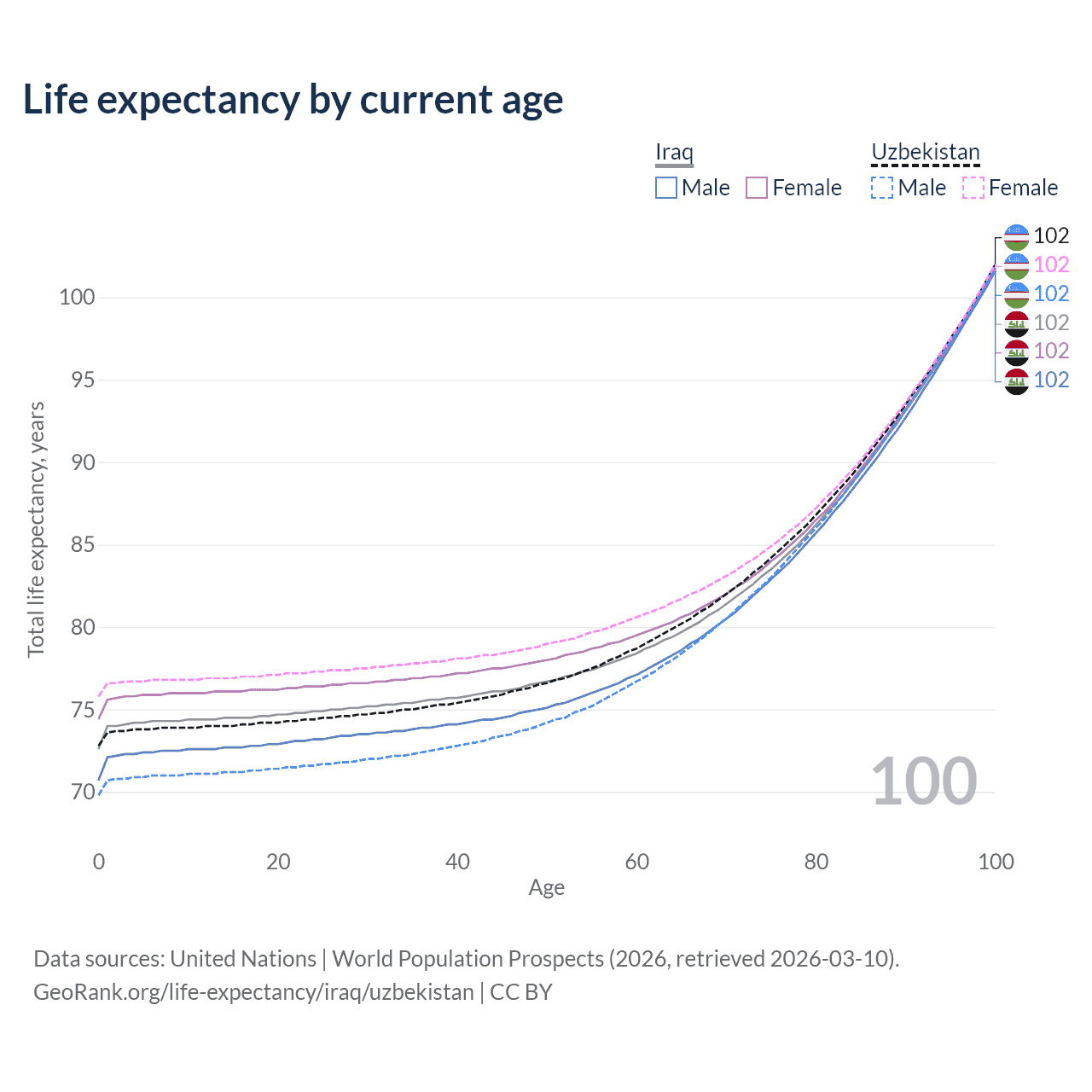 This life expectancy calculator shows the odds of living to 100, 95, 90, and below based on current age for both males and females in Iraq and Uzbekistan, along with mean and median age of death. The calculations are based on the 2026 life tables (actuarial tables) from the UN World Population Prospects.