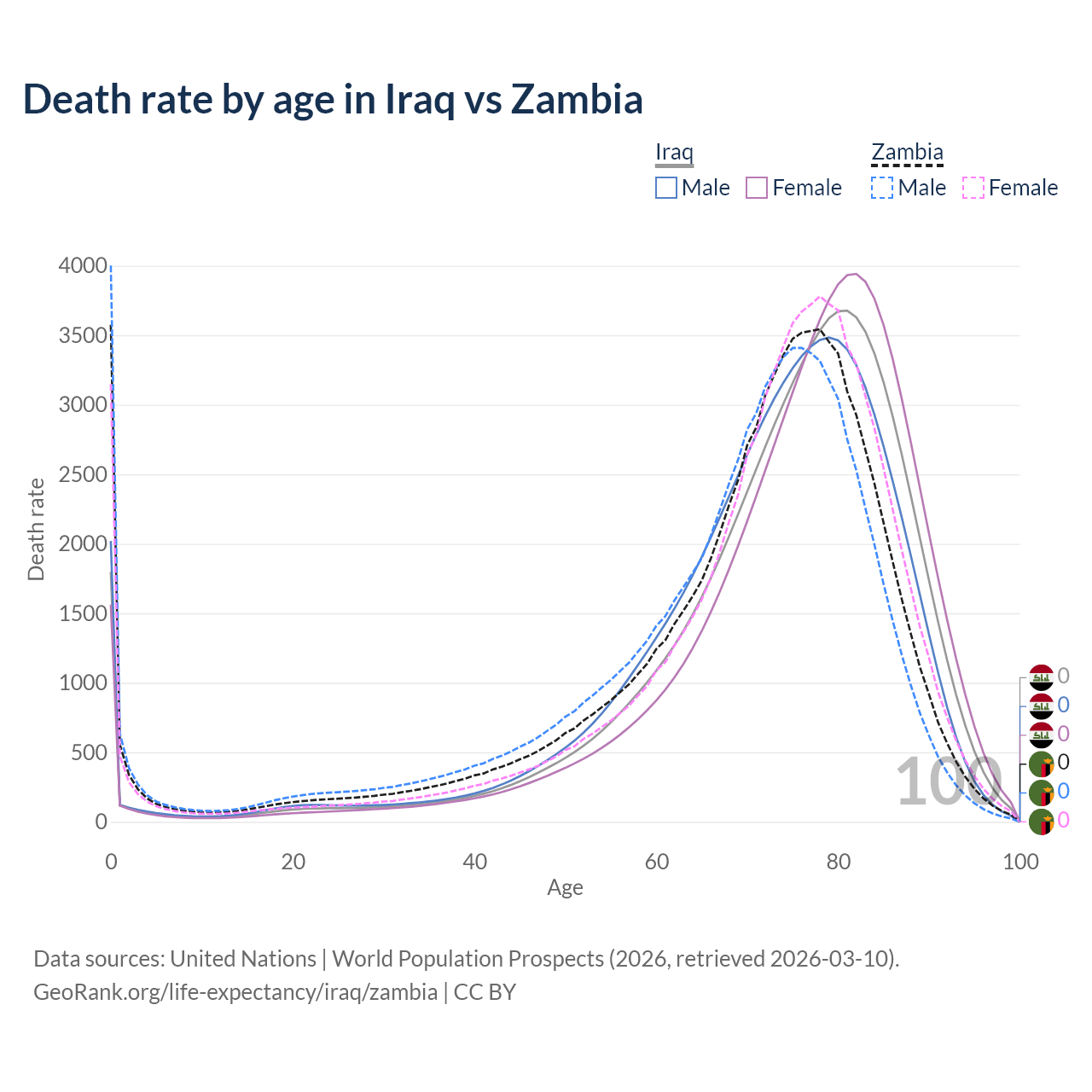 In Iraq, the most common age of death is 81, compared to 0 in Zambia. The median age of death is 76.7 in Iraq and 73.1 in Zambia, meaning only half of each cohort is expected to live past that age.
