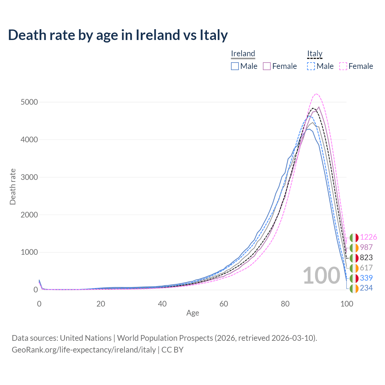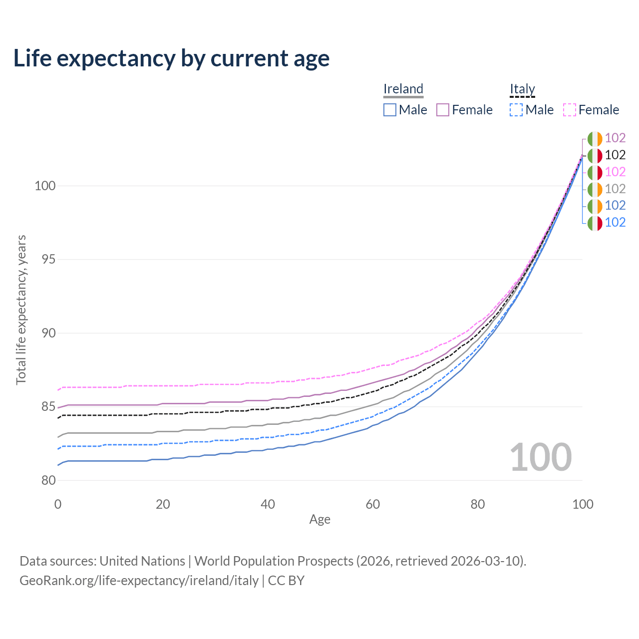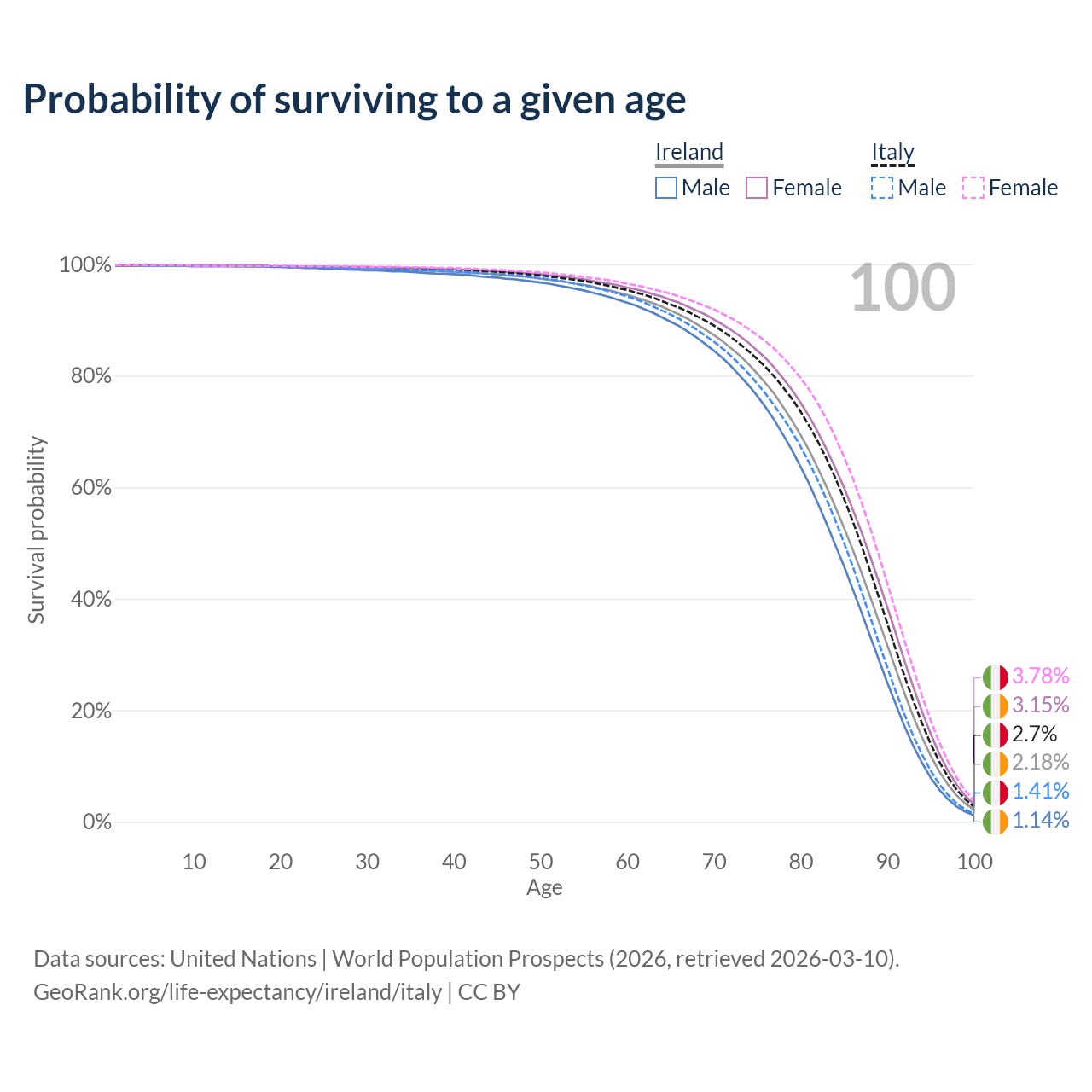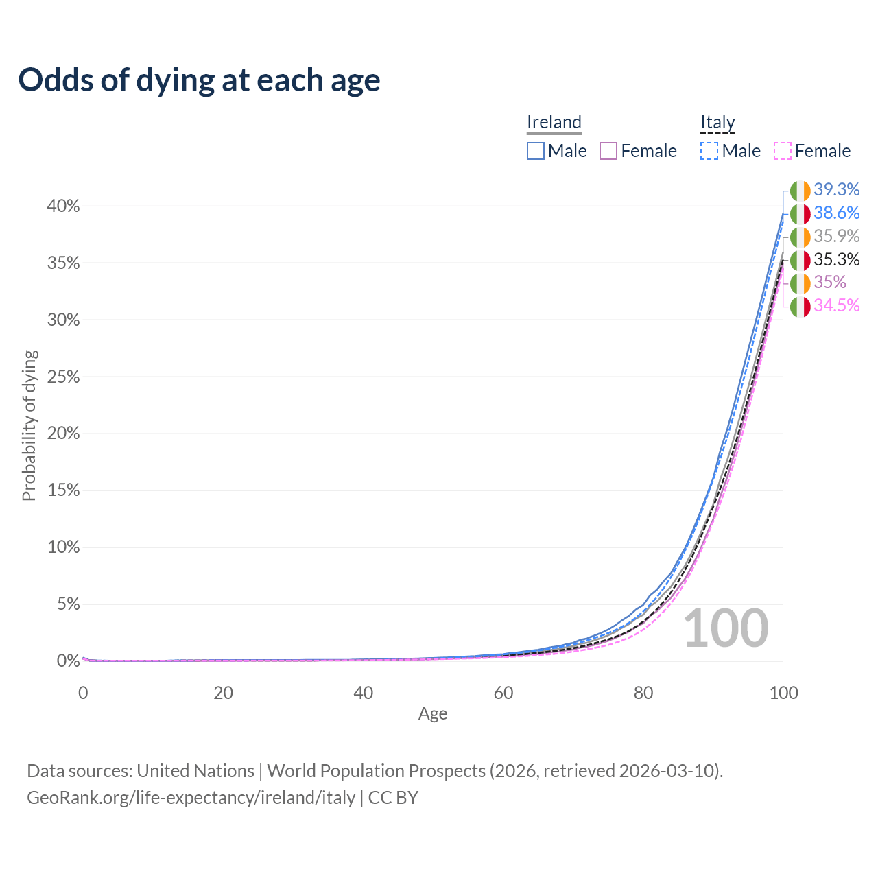 This life expectancy calculator shows the odds of living to 100, 95, 90, and below based on current age for both males and females in Ireland and Italy, along with mean and median age of death. The calculations are based on the 2026 life tables (actuarial tables) from the UN World Population Prospects.
