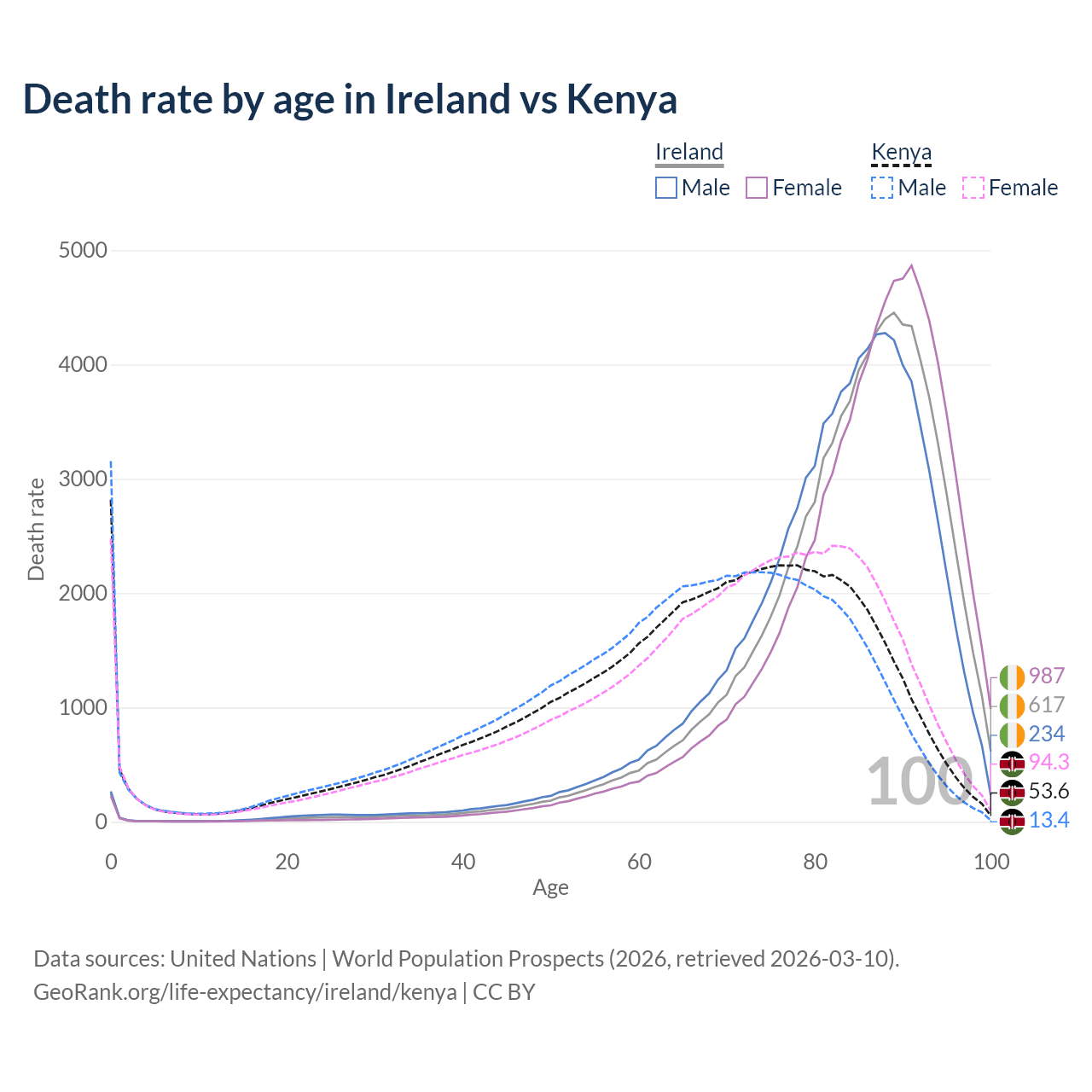 Note that this chart does not show rates per 100,000 population, as those would be skewed by age structure differences and reflect the demographics of Ireland and Kenya more than their death rates.