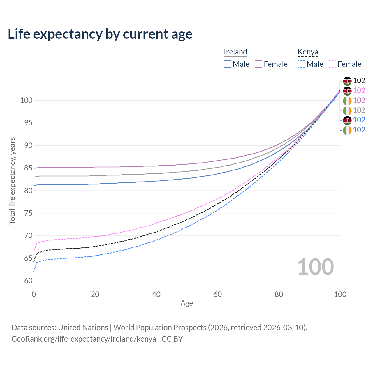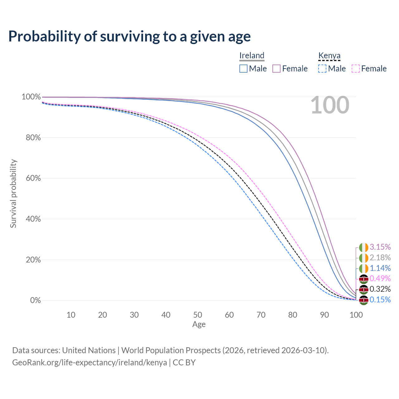 This life expectancy calculator shows the odds of living to 100, 95, 90, and below based on current age for both males and females in Ireland and Kenya, along with mean and median age of death. The calculations are based on the 2026 life tables (actuarial tables) from the UN World Population Prospects.