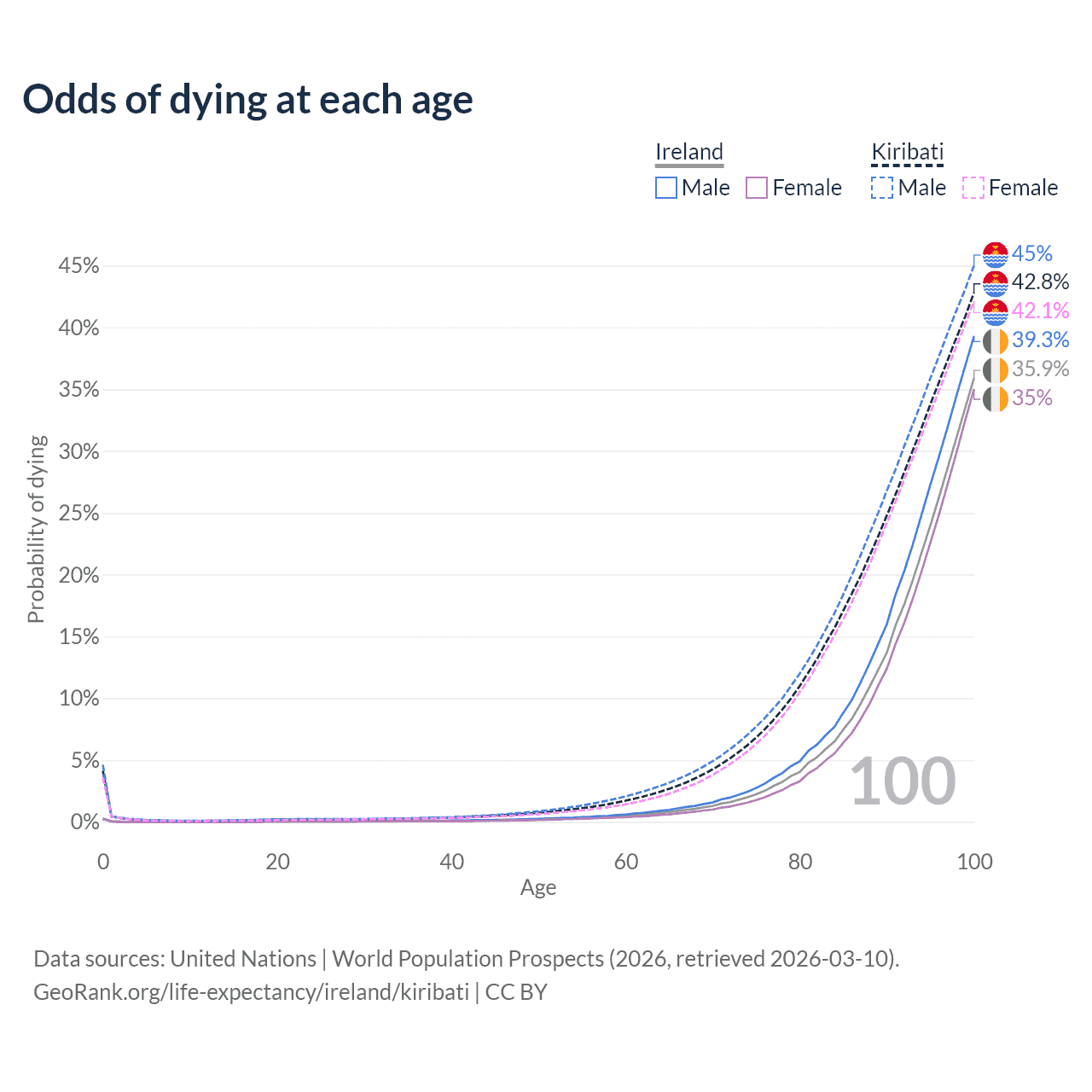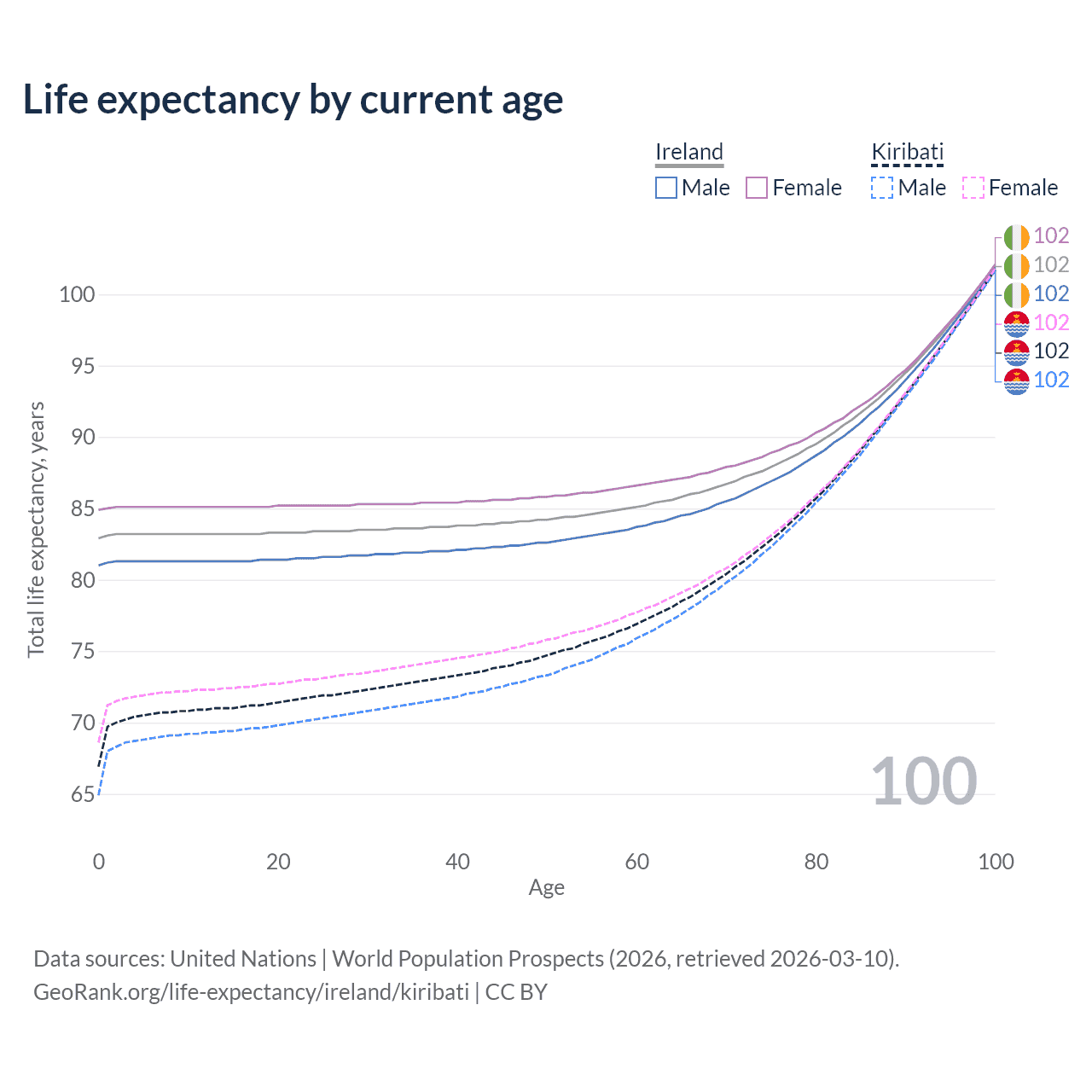 This life expectancy calculator shows the odds of living to 100, 95, 90, and below based on current age for both males and females in Ireland and Kiribati, along with mean and median age of death. The calculations are based on the 2026 life tables (actuarial tables) from the UN World Population Prospects.