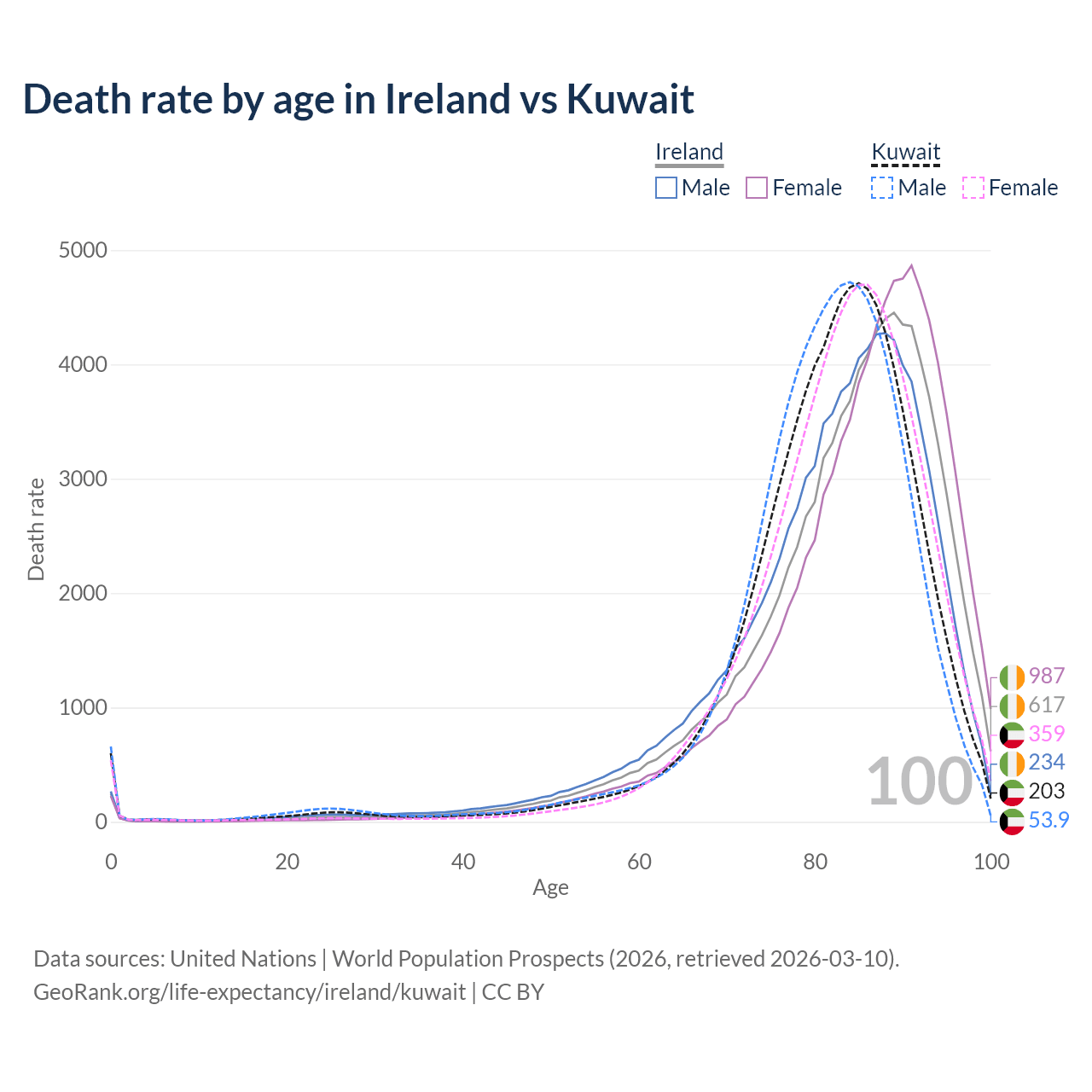 In Ireland, the most common age of death is 89, compared to 85 in Kuwait. The median age of death is 85.7 in Ireland and 83.3 in Kuwait, meaning only half of each cohort is expected to live past that age.