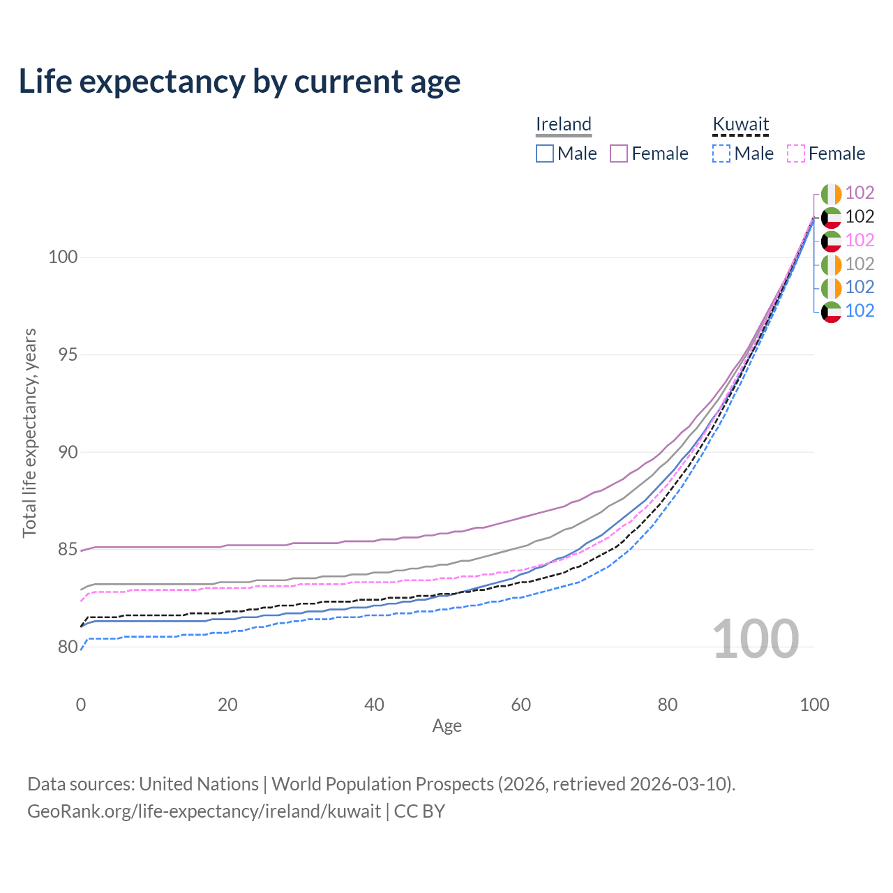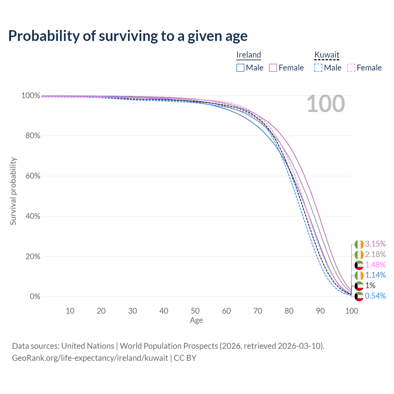 This life expectancy calculator shows the odds of living to 100, 95, 90, and below based on current age for both males and females in Ireland and Kuwait, along with mean and median age of death. The calculations are based on the 2026 life tables (actuarial tables) from the UN World Population Prospects.