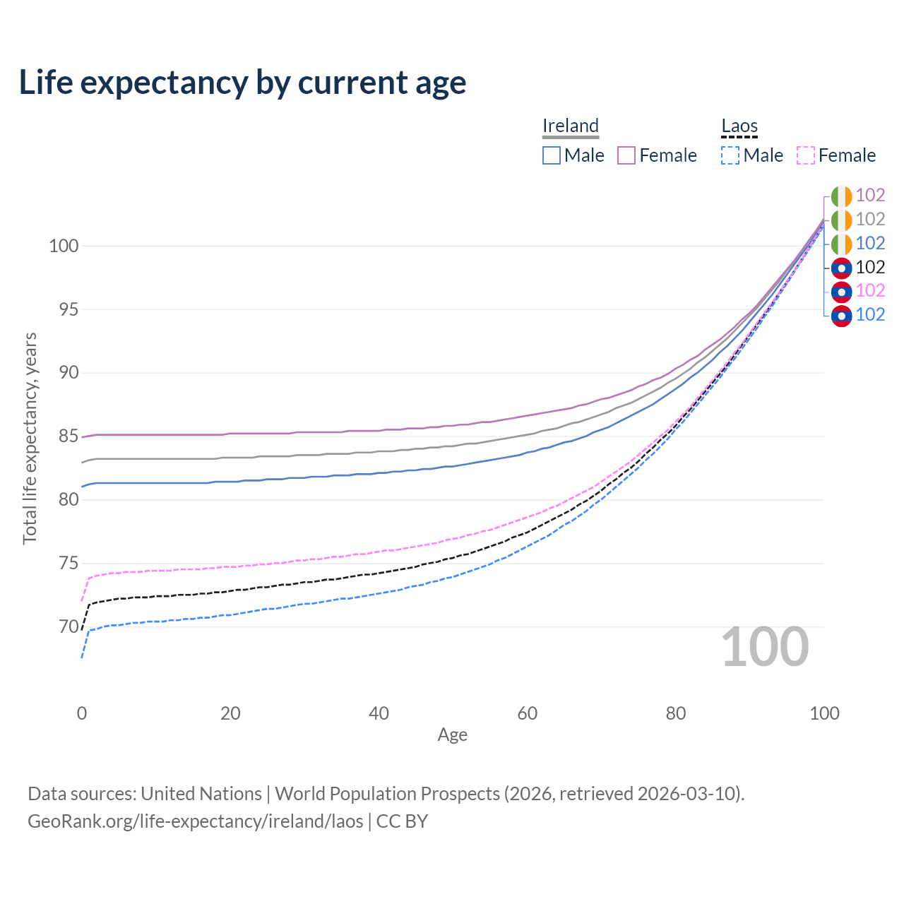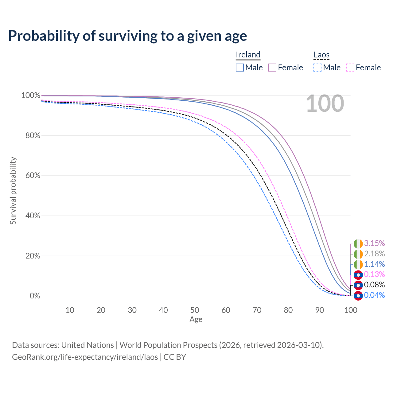 This life expectancy calculator shows the odds of living to 100, 95, 90, and below based on current age for both males and females in Ireland and Laos, along with mean and median age of death. The calculations are based on the 2026 life tables (actuarial tables) from the UN World Population Prospects.