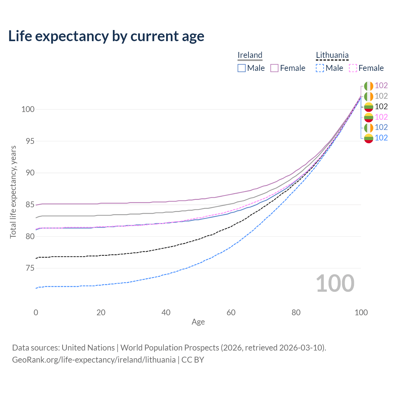 This life expectancy calculator shows the odds of living to 100, 95, 90, and below based on current age for both males and females in Ireland and Lithuania, along with mean and median age of death. The calculations are based on the 2026 life tables (actuarial tables) from the UN World Population Prospects.