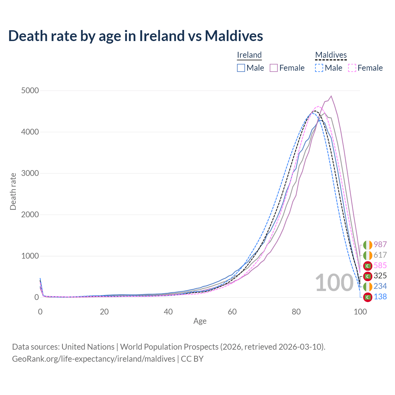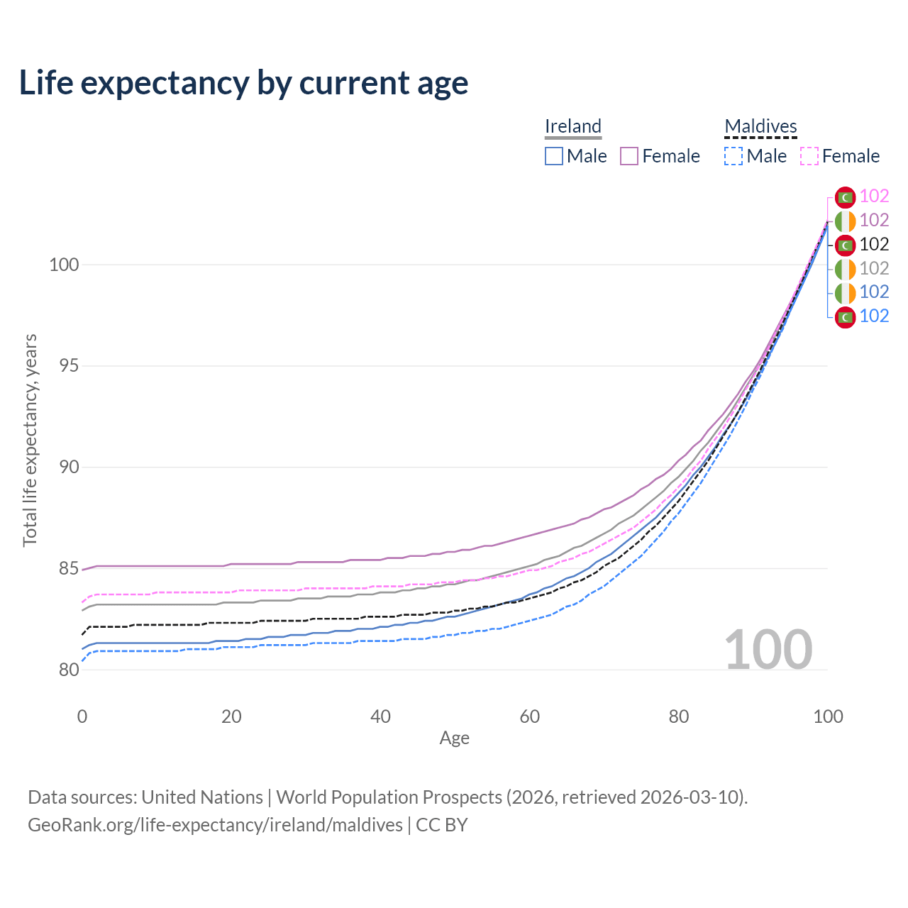 This life expectancy calculator shows the odds of living to 100, 95, 90, and below based on current age for both males and females in Ireland and Maldives, along with mean and median age of death. The calculations are based on the 2026 life tables (actuarial tables) from the UN World Population Prospects.