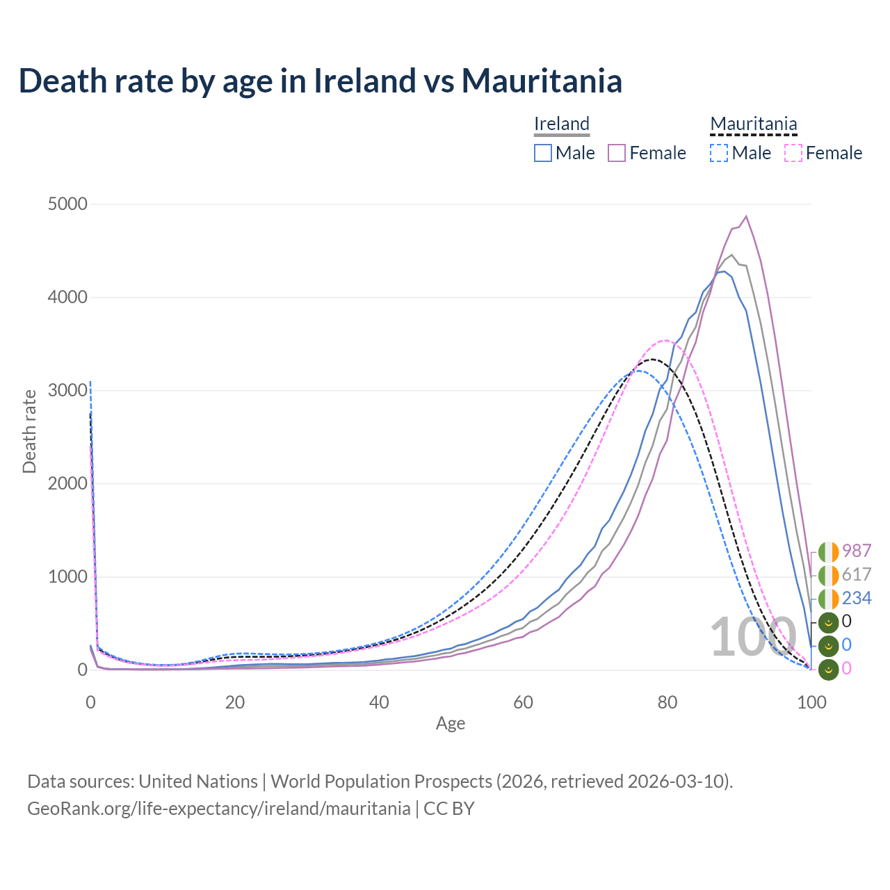 In Ireland, the most common age of death is 89, compared to 78 in Mauritania. The median age of death is 85.7 in Ireland and 74.1 in Mauritania, meaning only half of each cohort is expected to live past that age.
