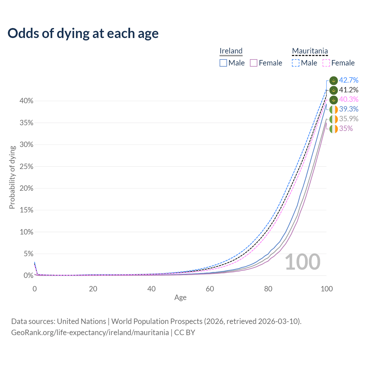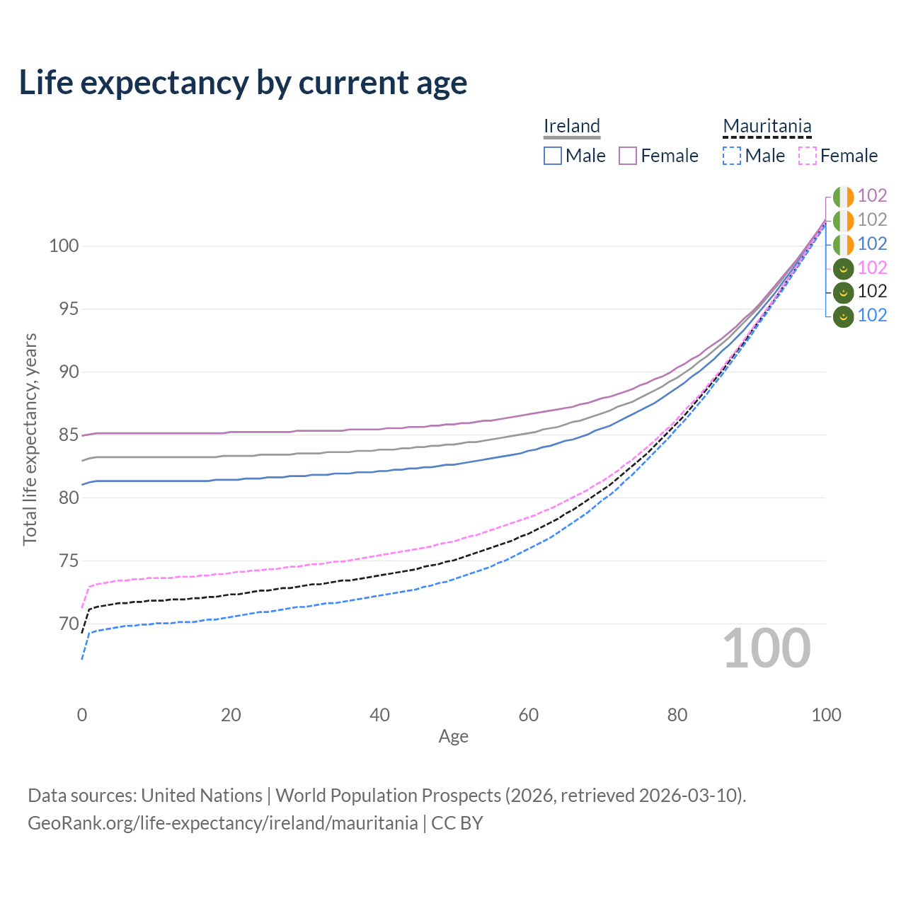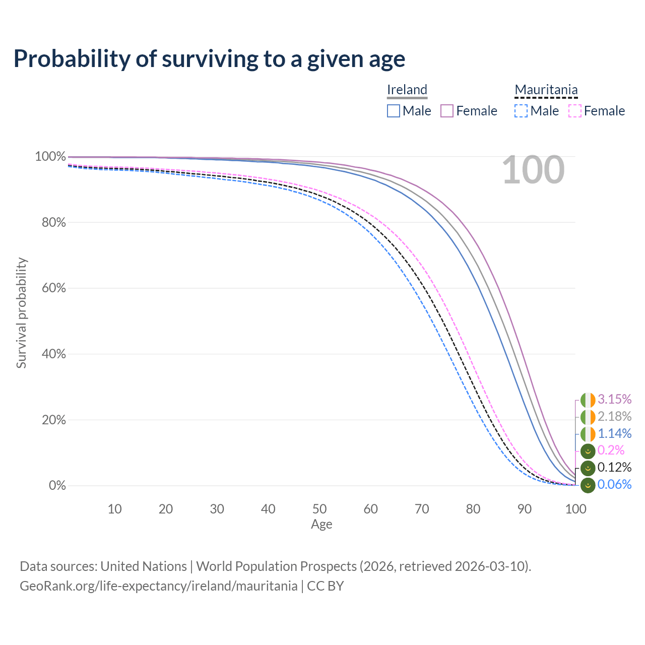 This life expectancy calculator shows the odds of living to 100, 95, 90, and below based on current age for both males and females in Ireland and Mauritania, along with mean and median age of death. The calculations are based on the 2026 life tables (actuarial tables) from the UN World Population Prospects.