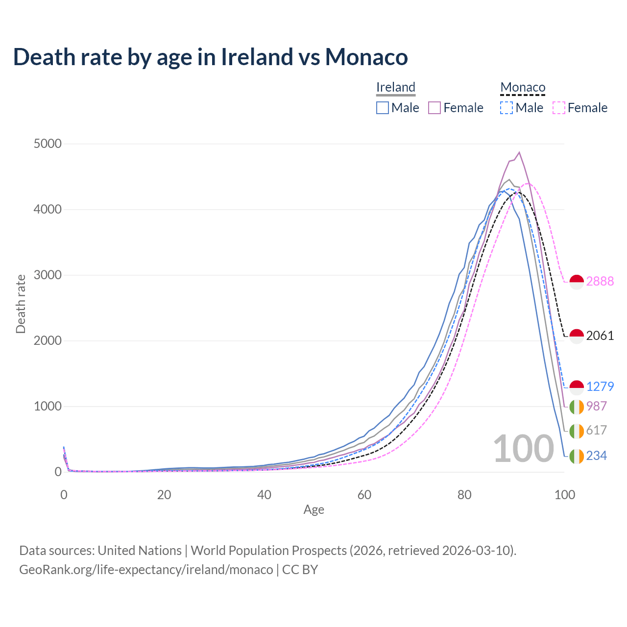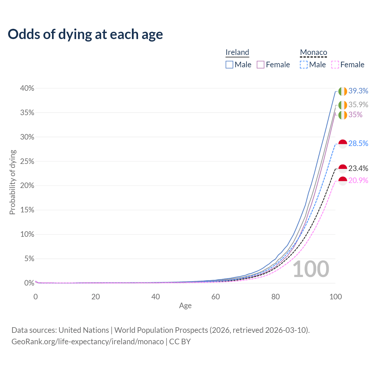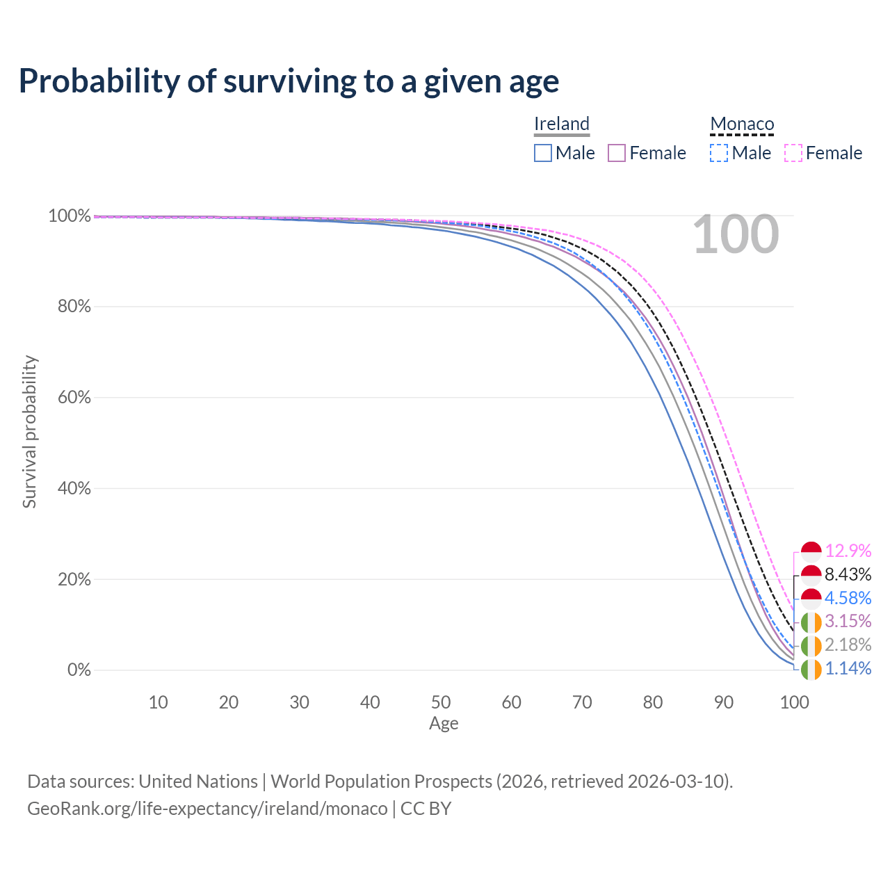 This life expectancy calculator shows the odds of living to 100, 95, 90, and below based on current age for both males and females in Ireland and Monaco, along with mean and median age of death. The calculations are based on the 2026 life tables (actuarial tables) from the UN World Population Prospects.