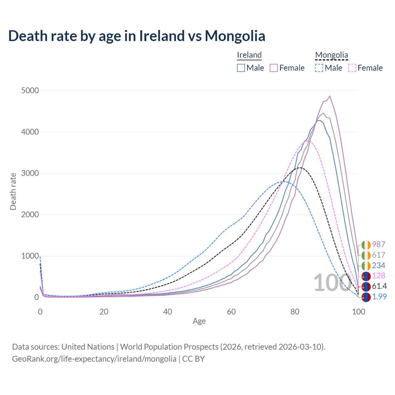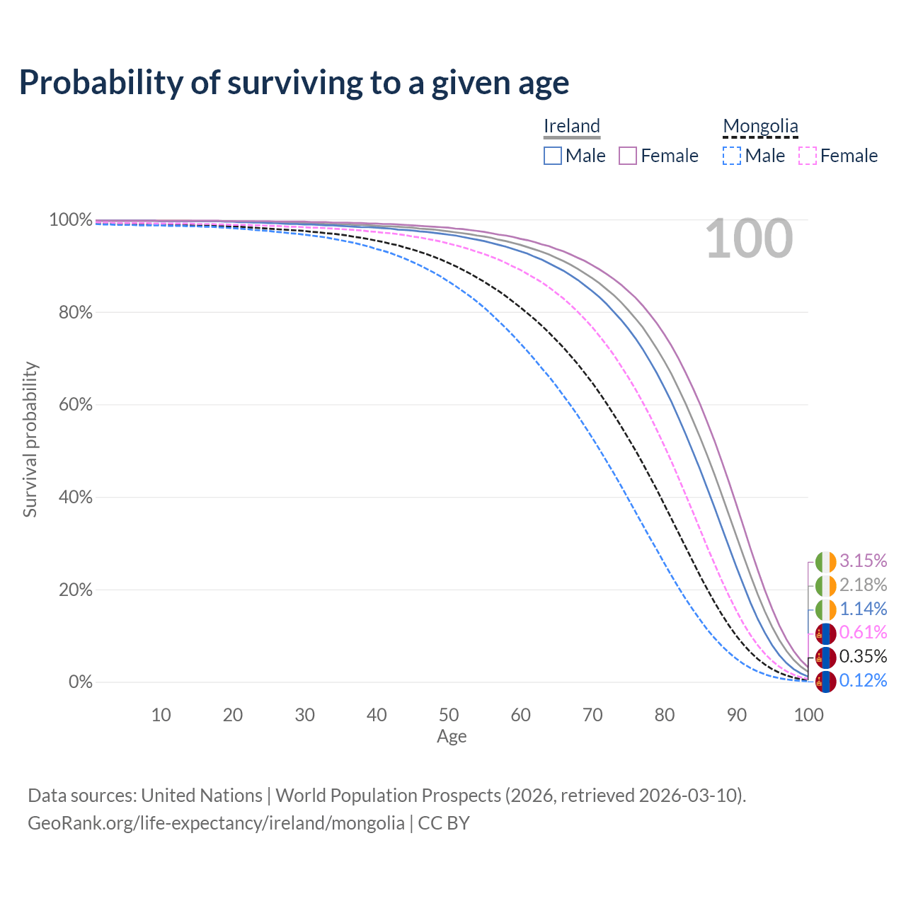 This life expectancy calculator shows the odds of living to 100, 95, 90, and below based on current age for both males and females in Ireland and Mongolia, along with mean and median age of death. The calculations are based on the 2026 life tables (actuarial tables) from the UN World Population Prospects.