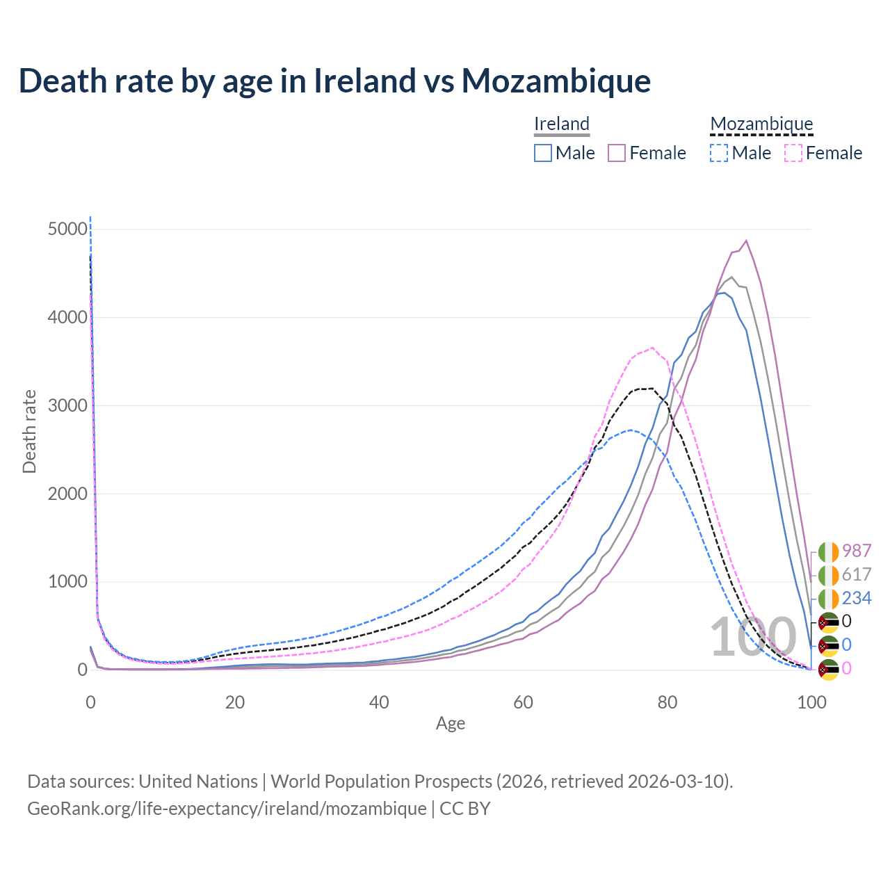 Note that this chart does not show rates per 100,000 population, as those would be skewed by age structure differences and reflect the demographics of Ireland and Mozambique more than their death rates.