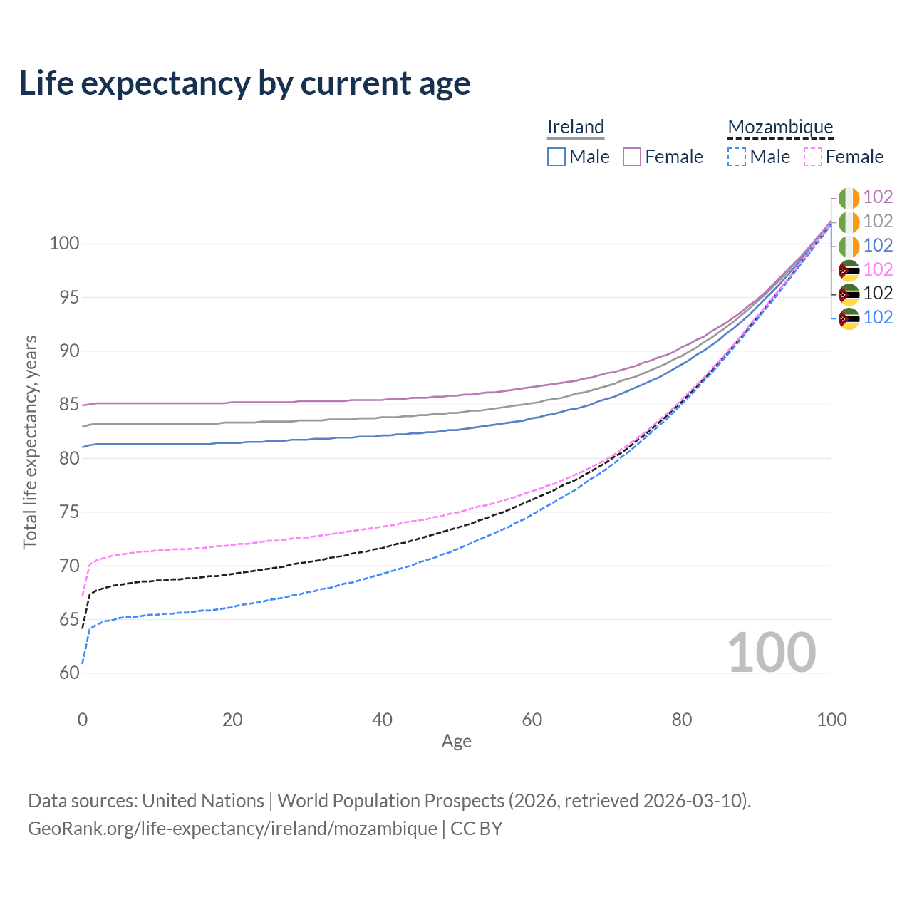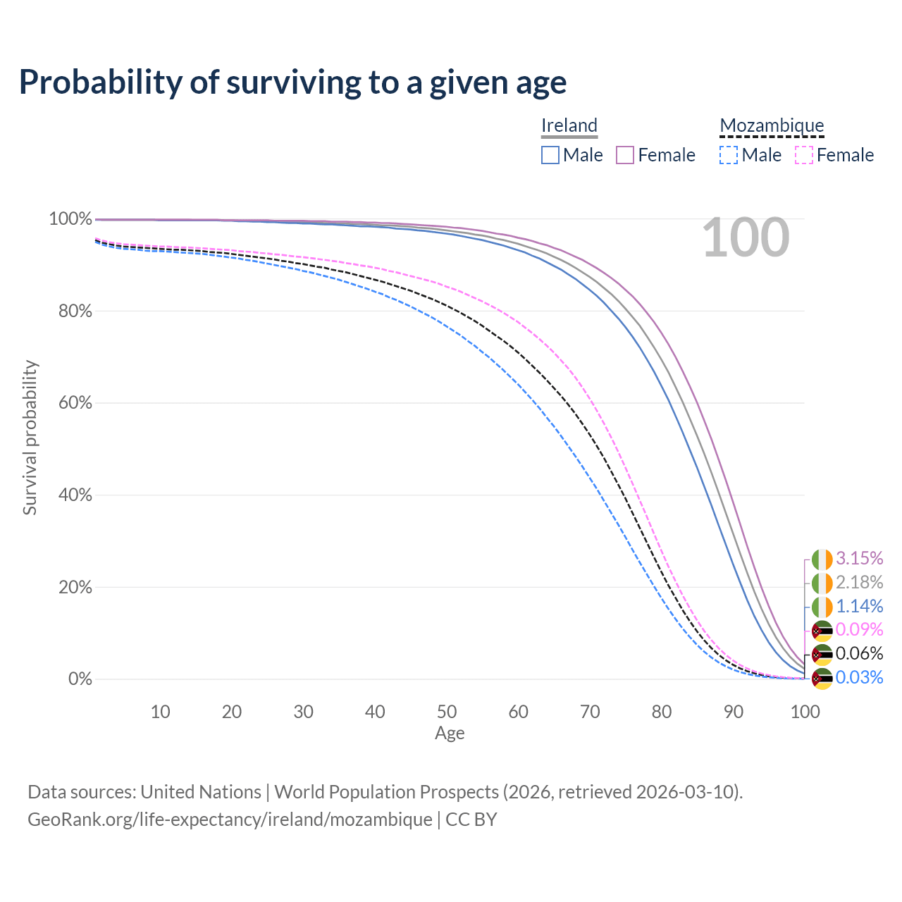 This life expectancy calculator shows the odds of living to 100, 95, 90, and below based on current age for both males and females in Ireland and Mozambique, along with mean and median age of death. The calculations are based on the 2026 life tables (actuarial tables) from the UN World Population Prospects.