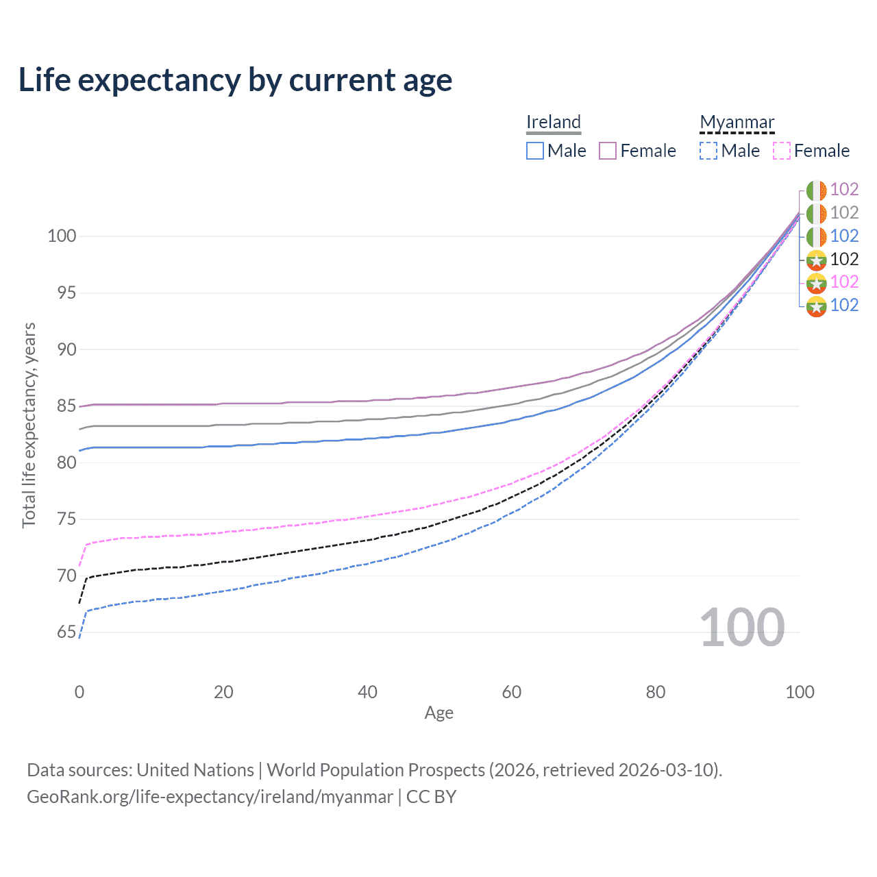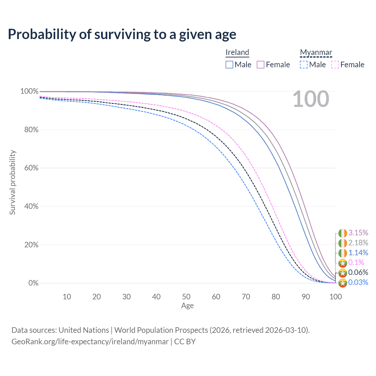 This life expectancy calculator shows the odds of living to 100, 95, 90, and below based on current age for both males and females in Ireland and Myanmar, along with mean and median age of death. The calculations are based on the 2026 life tables (actuarial tables) from the UN World Population Prospects.
