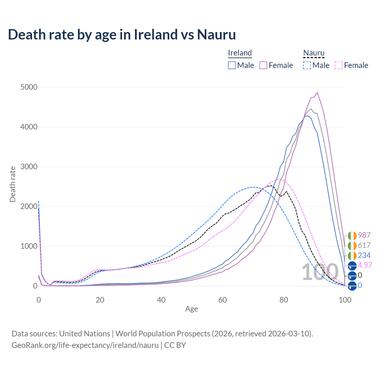 In Ireland, the most common age of death is 89, compared to 76 in Nauru. The median age of death is 85.7 in Ireland and 67.3 in Nauru, meaning only half of each cohort is expected to live past that age.