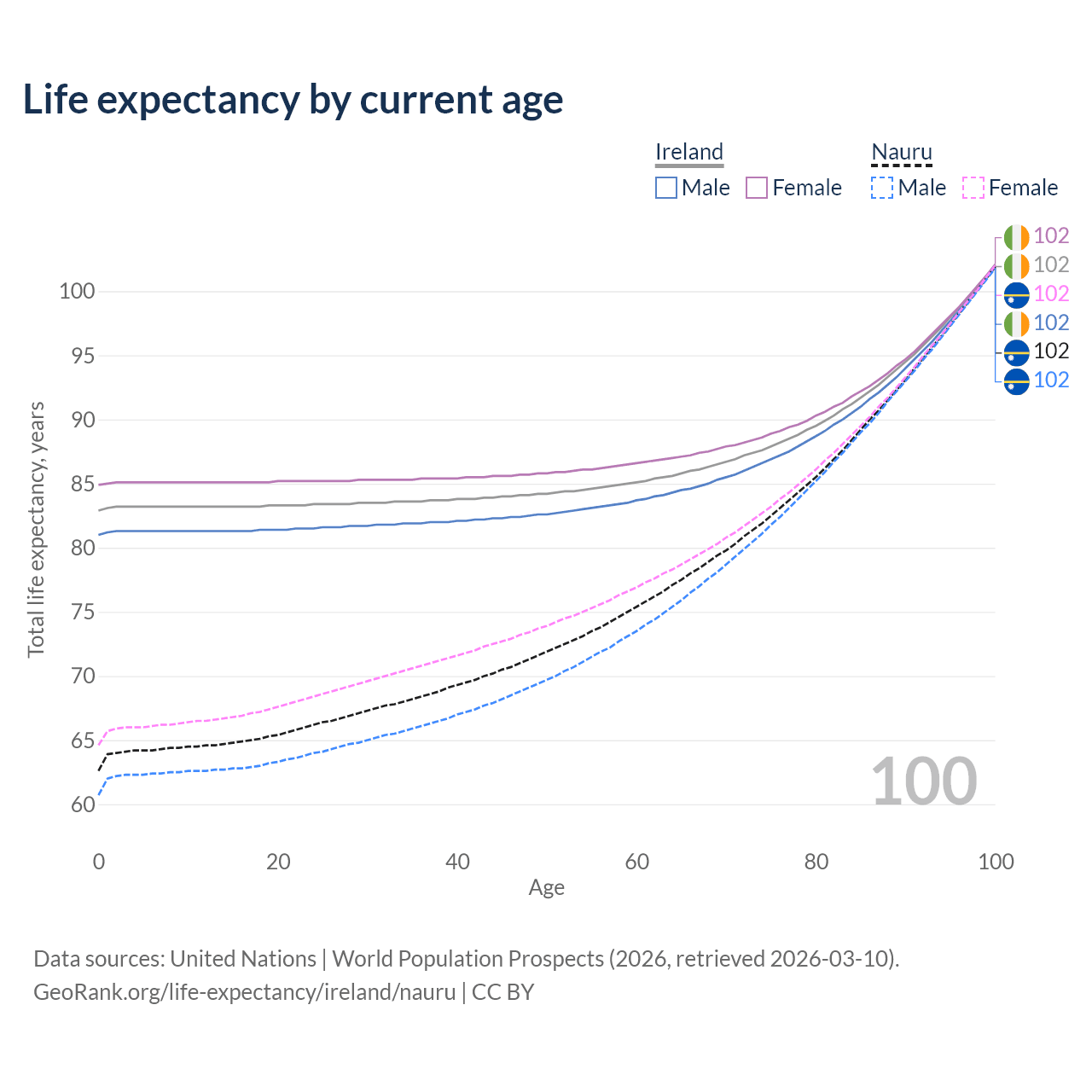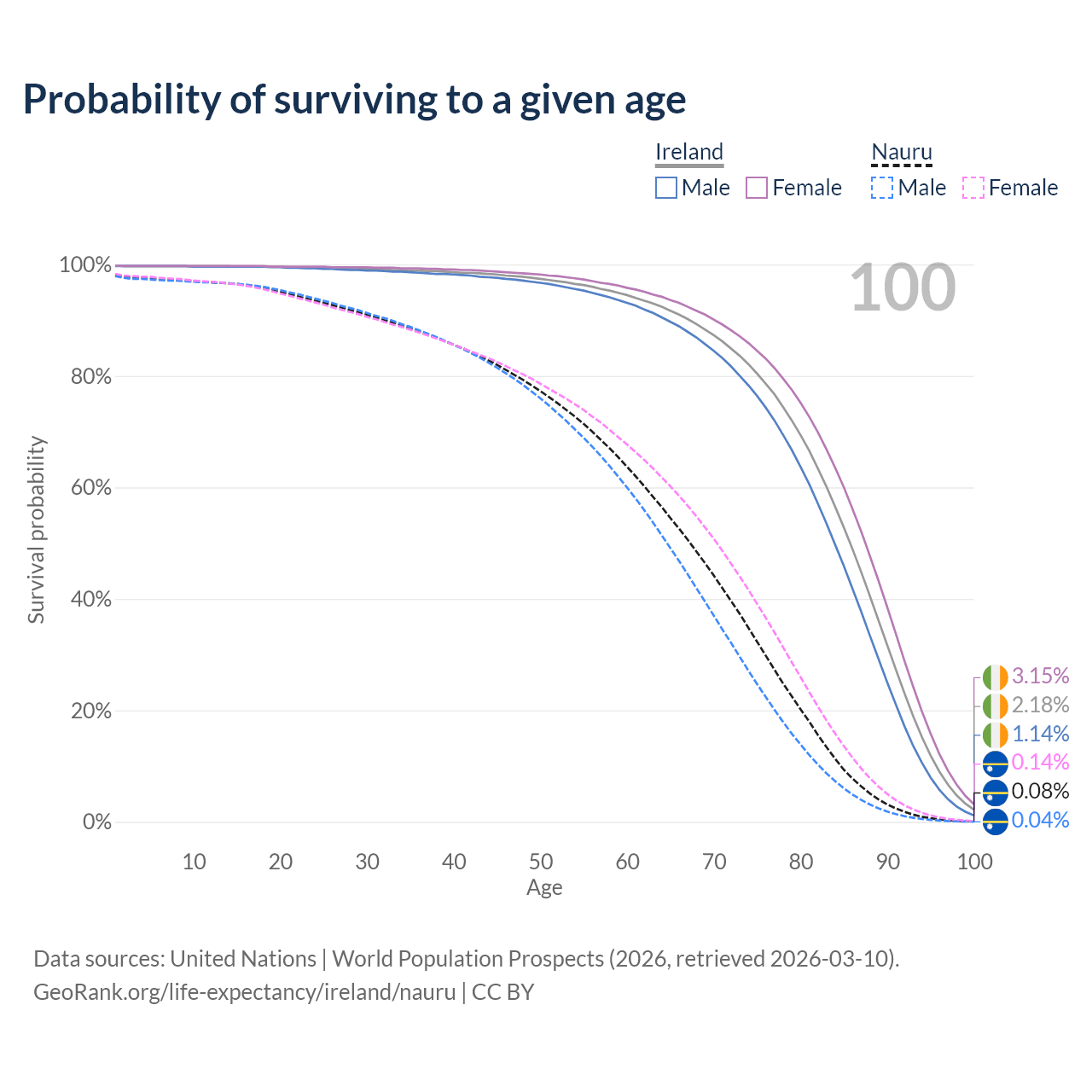 This life expectancy calculator shows the odds of living to 100, 95, 90, and below based on current age for both males and females in Ireland and Nauru, along with mean and median age of death. The calculations are based on the 2026 life tables (actuarial tables) from the UN World Population Prospects.