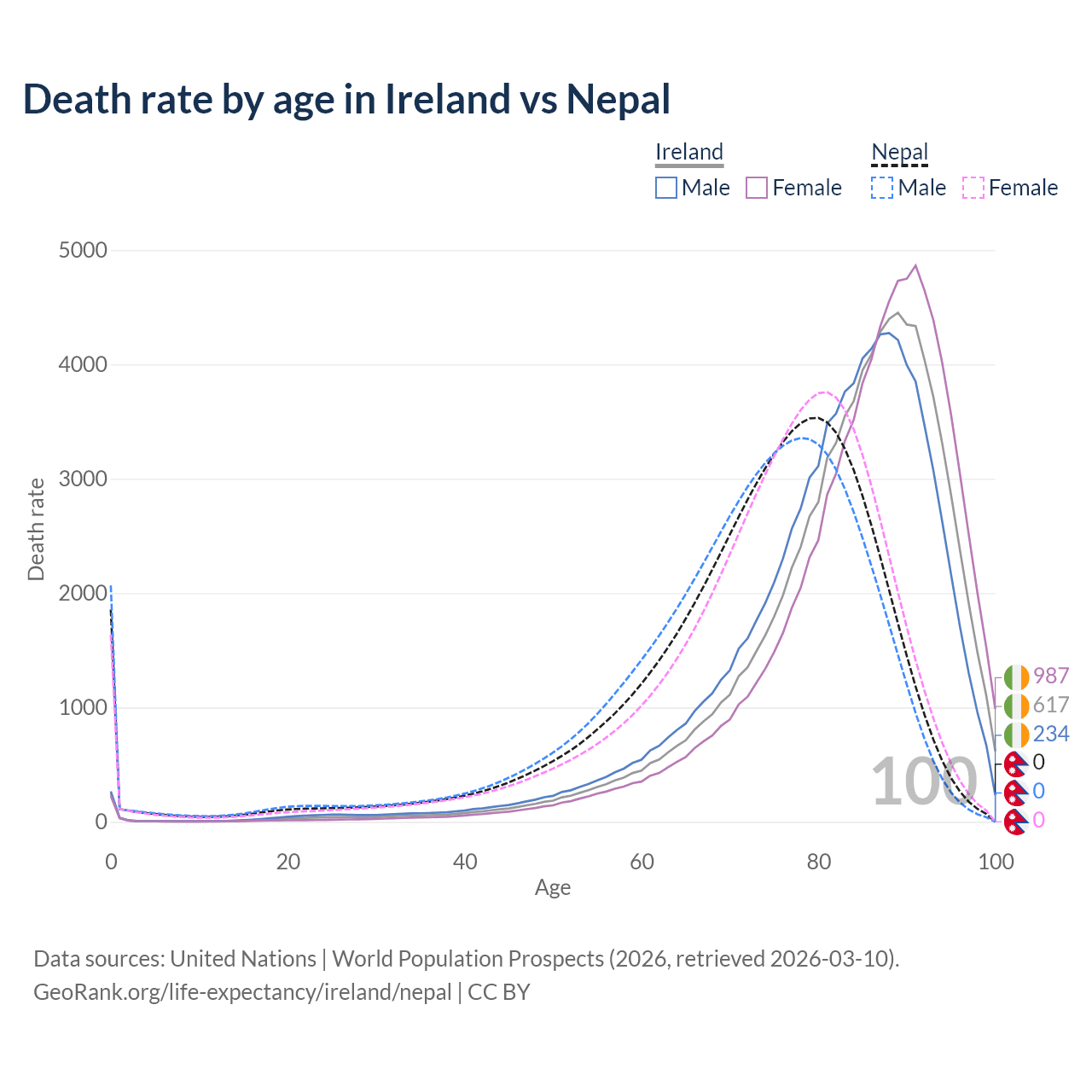 This life expectancy calculator shows the odds of living to 100, 95, 90, and below based on current age for both males and females in Ireland and Nepal, along with mean and median age of death. The calculations are based on the 2026 life tables (actuarial tables) from the UN World Population Prospects.