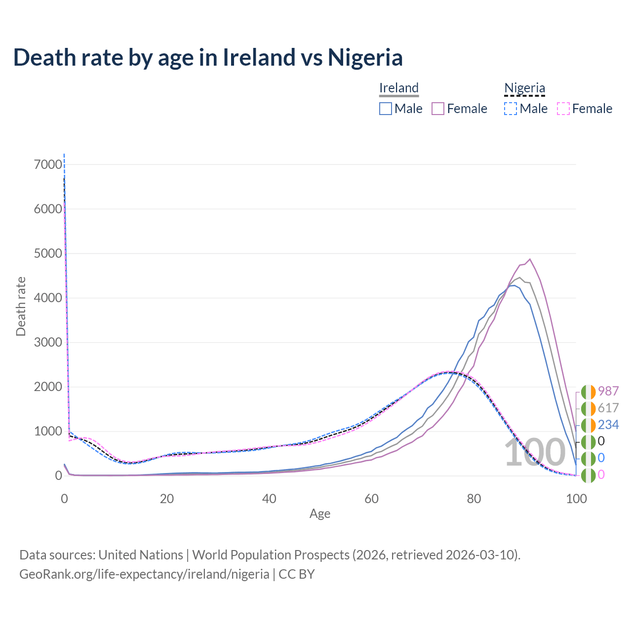 In Ireland, the most common age of death is 89, compared to 0 in Nigeria. The median age of death is 85.7 in Ireland and 64.3 in Nigeria, meaning only half of each cohort is expected to live past that age.
