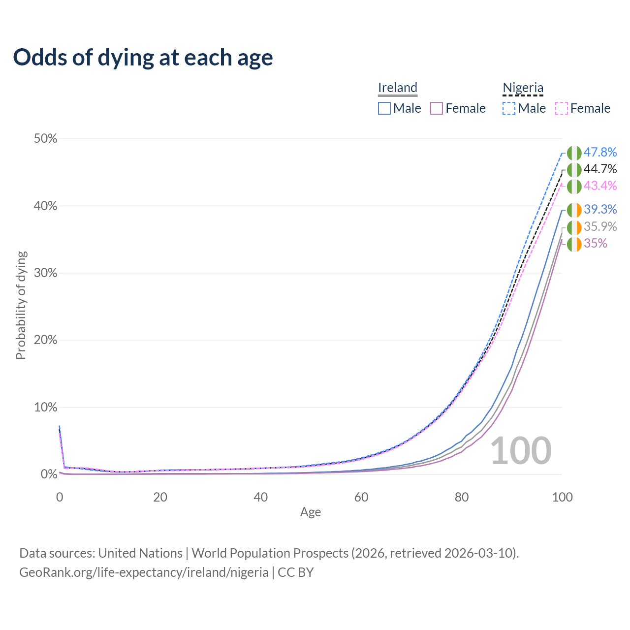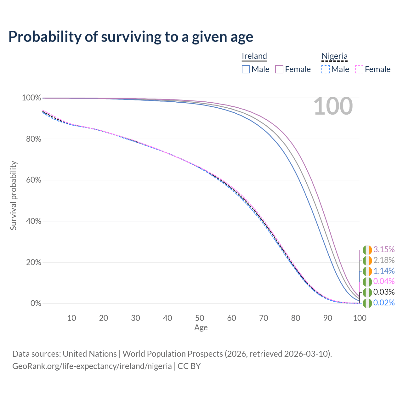 This life expectancy calculator shows the odds of living to 100, 95, 90, and below based on current age for both males and females in Ireland and Nigeria, along with mean and median age of death. The calculations are based on the 2026 life tables (actuarial tables) from the UN World Population Prospects.