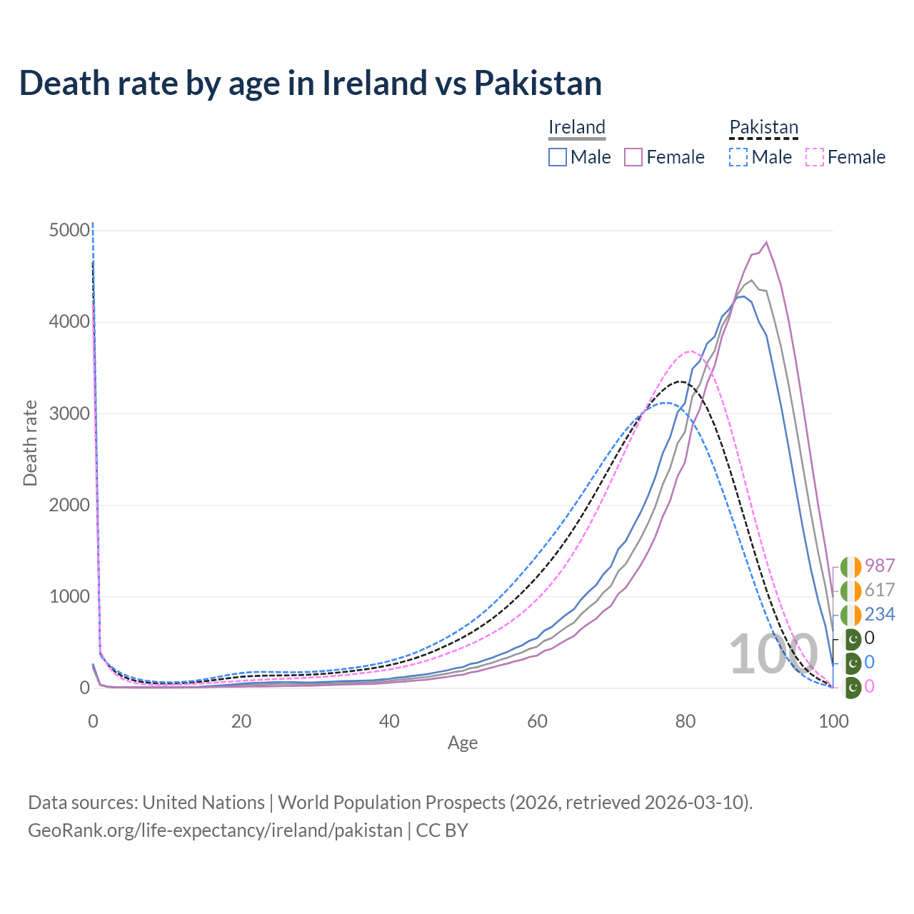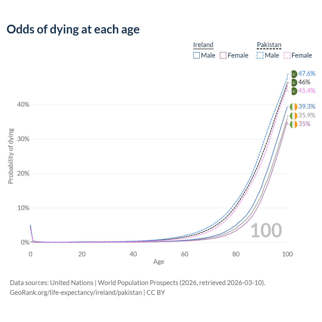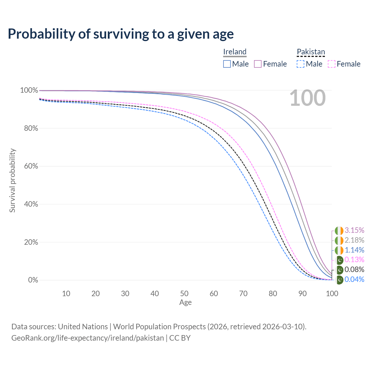 This life expectancy calculator shows the odds of living to 100, 95, 90, and below based on current age for both males and females in Ireland and Pakistan, along with mean and median age of death. The calculations are based on the 2026 life tables (actuarial tables) from the UN World Population Prospects.