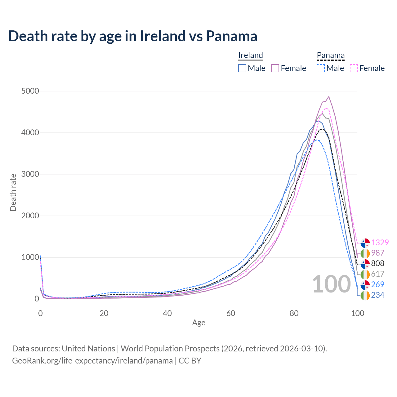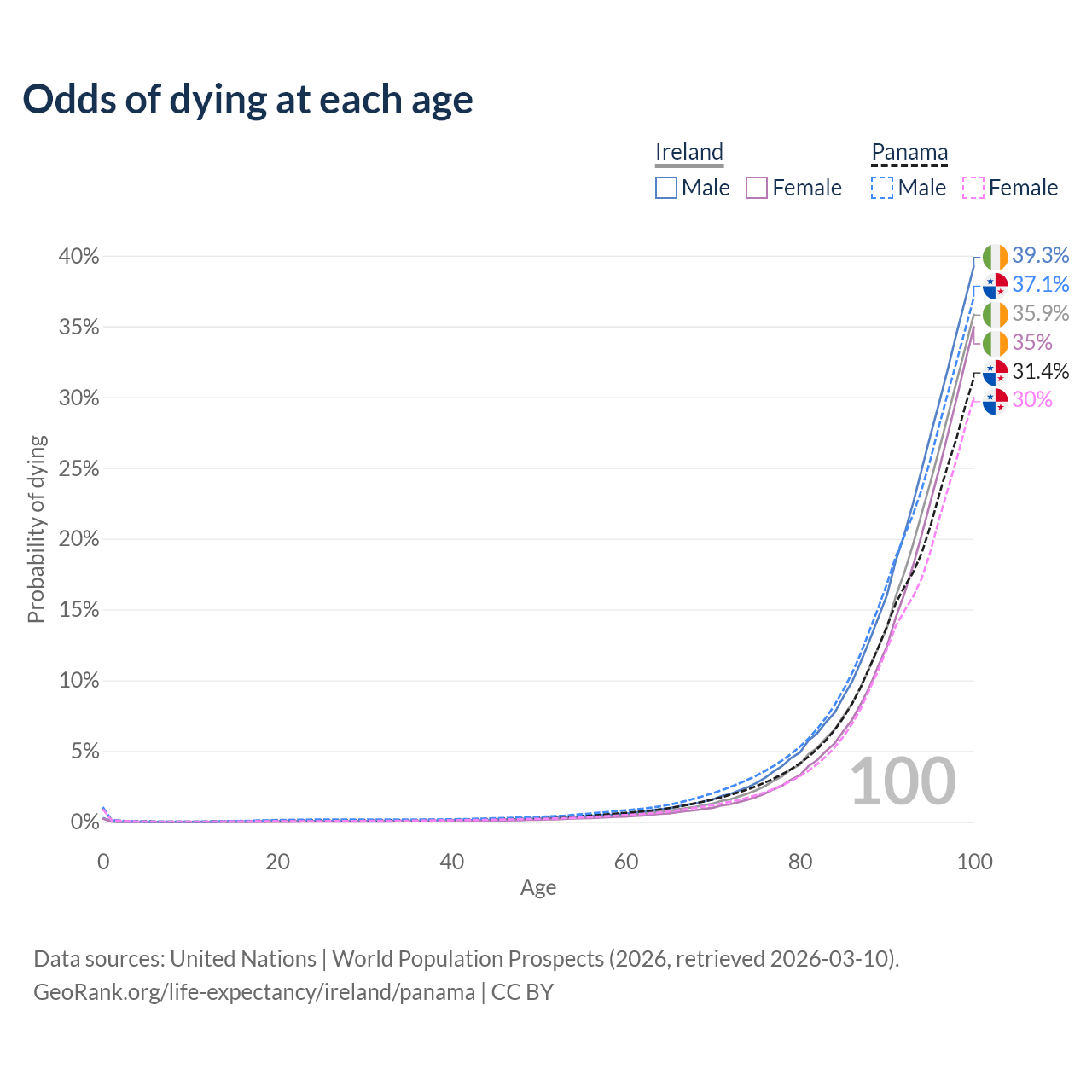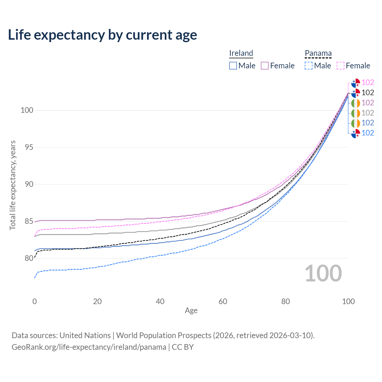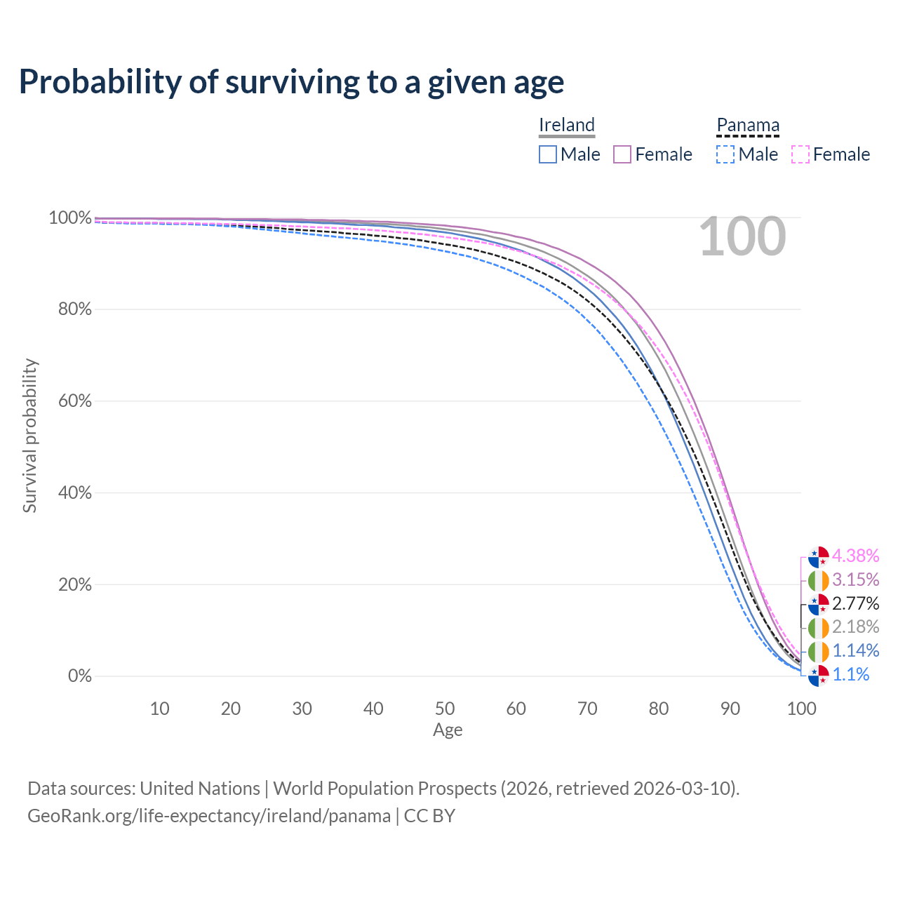This life expectancy calculator shows the odds of living to 100, 95, 90, and below based on current age for both males and females in Ireland and Panama, along with mean and median age of death. The calculations are based on the 2026 life tables (actuarial tables) from the UN World Population Prospects.