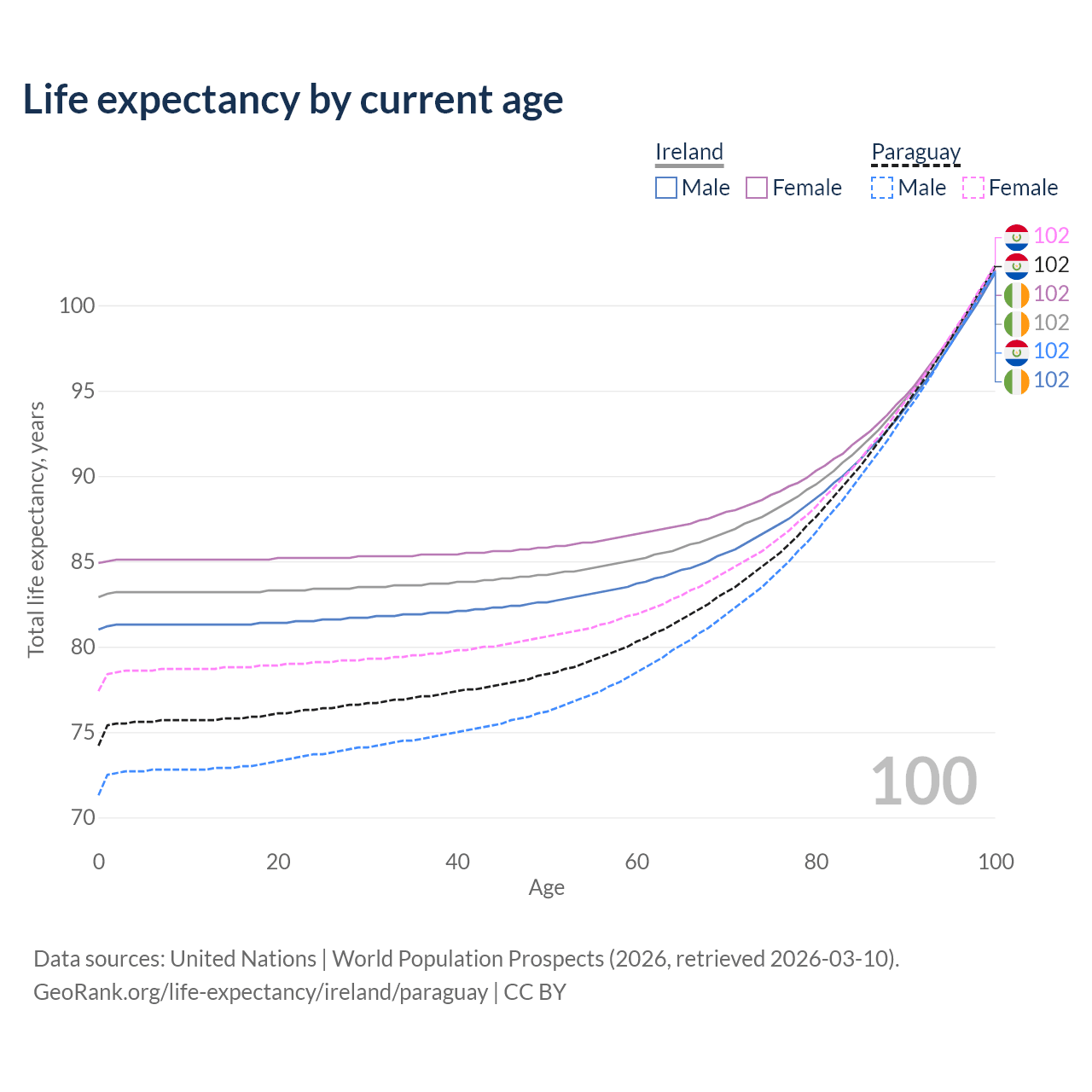 This life expectancy calculator shows the odds of living to 100, 95, 90, and below based on current age for both males and females in Ireland and Paraguay, along with mean and median age of death. The calculations are based on the 2026 life tables (actuarial tables) from the UN World Population Prospects.