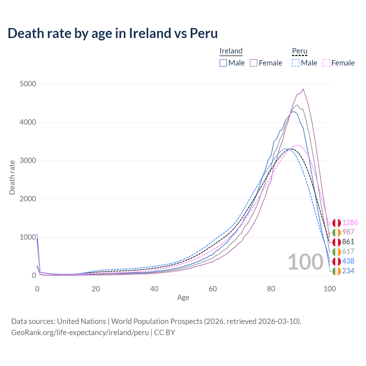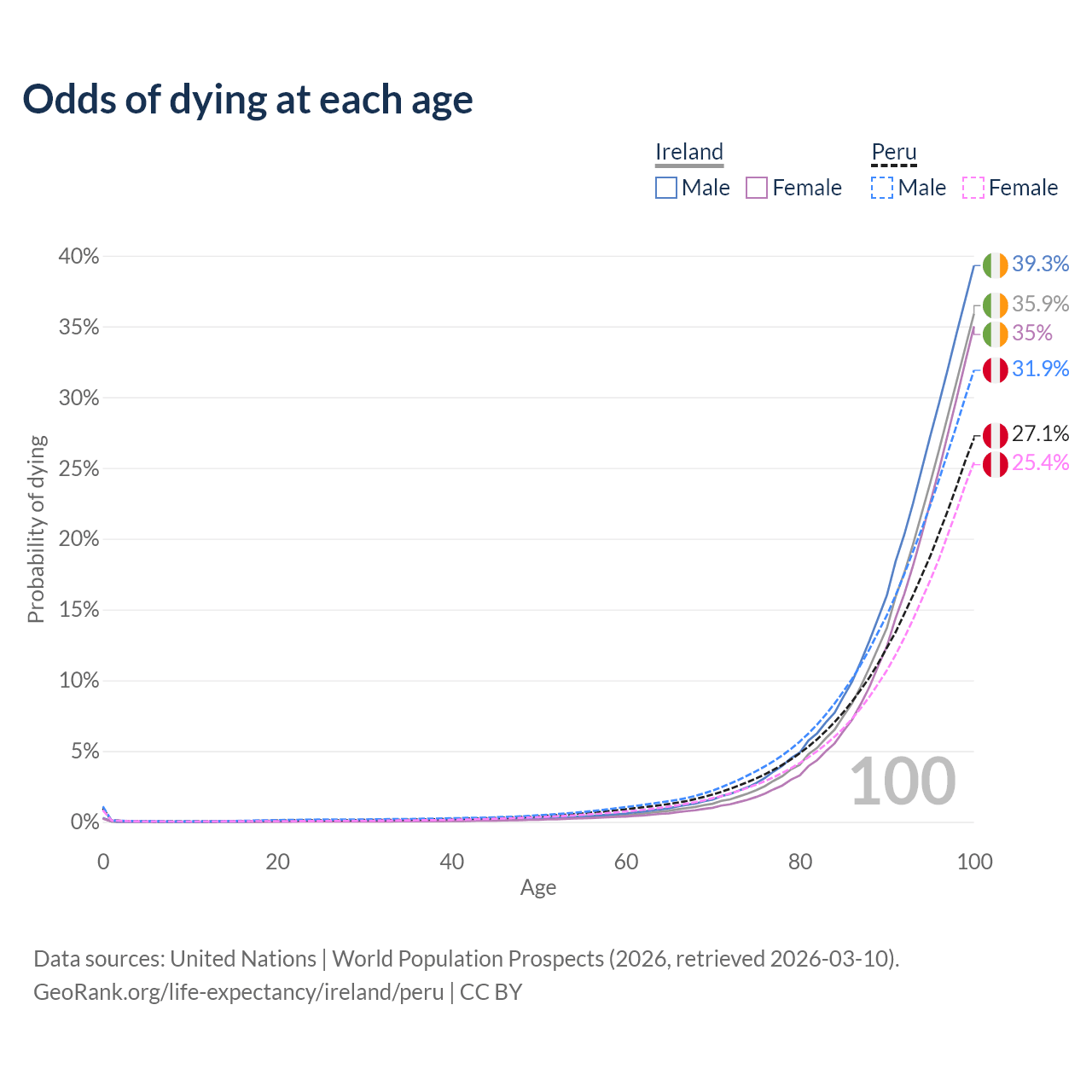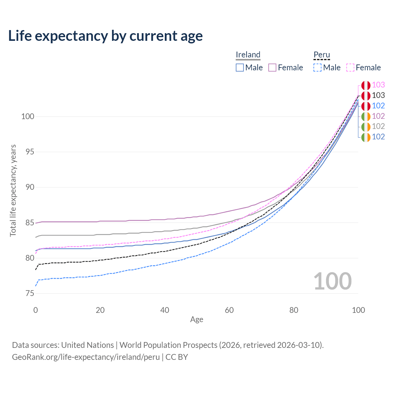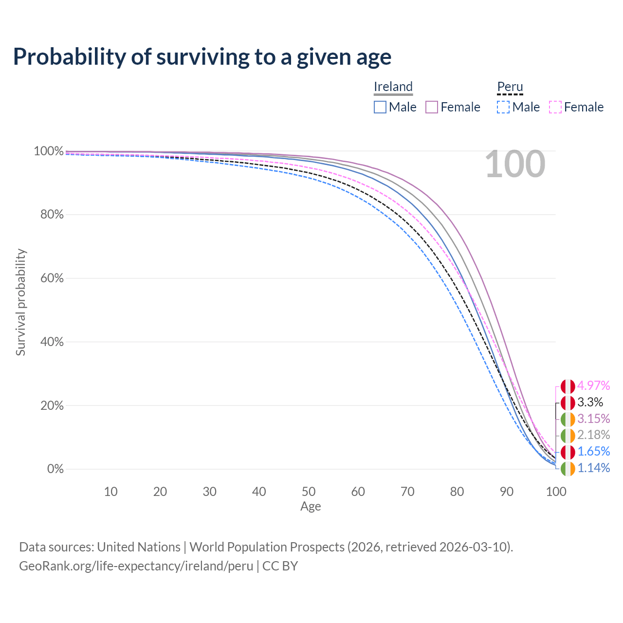 This life expectancy calculator shows the odds of living to 100, 95, 90, and below based on current age for both males and females in Ireland and Peru, along with mean and median age of death. The calculations are based on the 2026 life tables (actuarial tables) from the UN World Population Prospects.