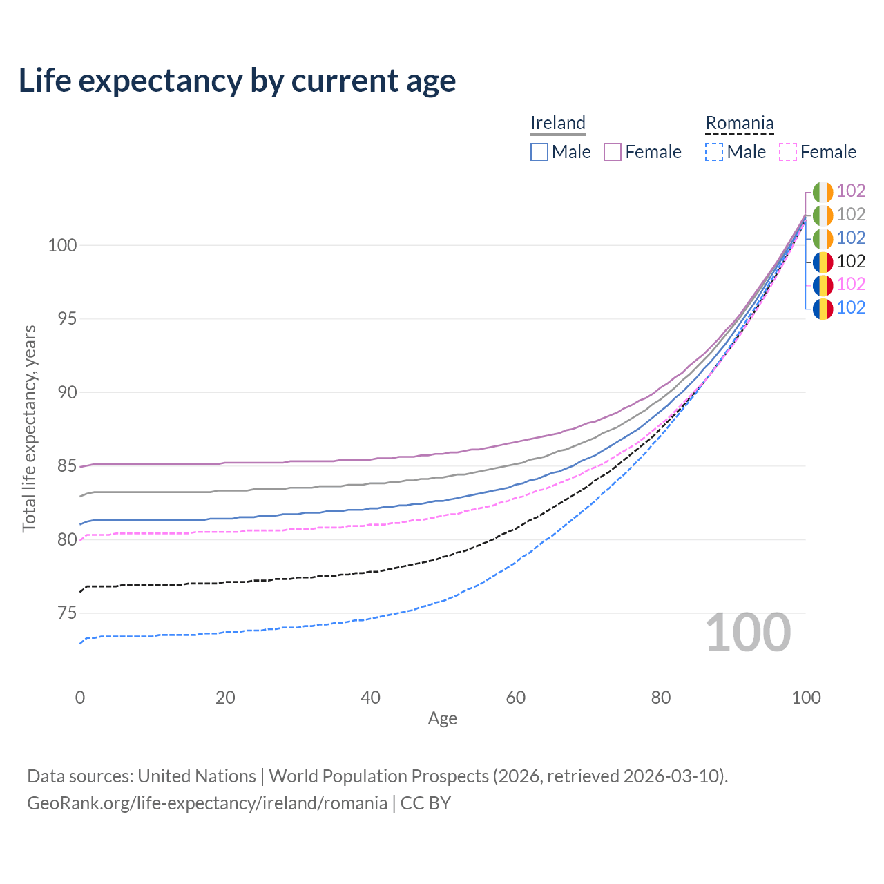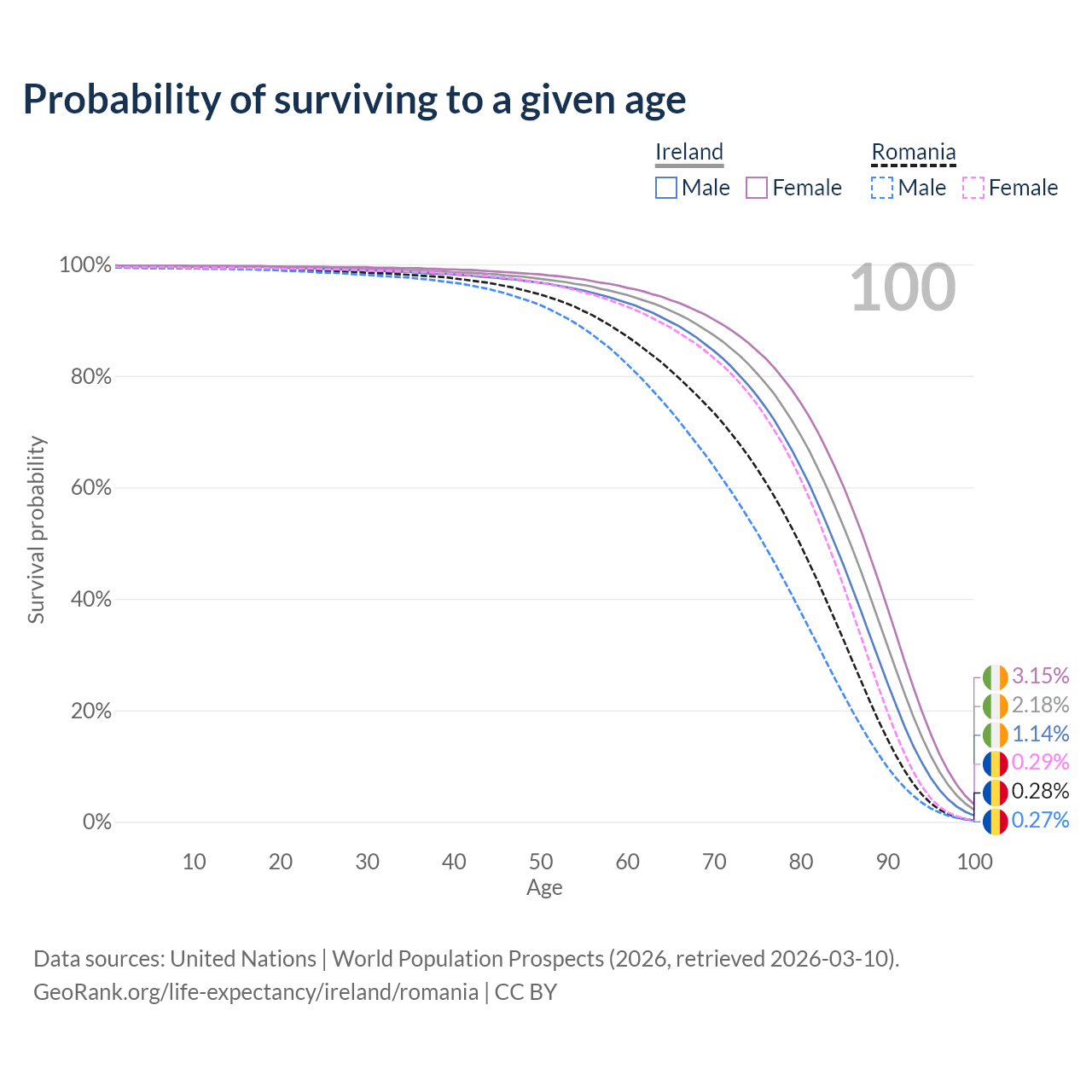This life expectancy calculator shows the odds of living to 100, 95, 90, and below based on current age for both males and females in Ireland and Romania, along with mean and median age of death. The calculations are based on the 2026 life tables (actuarial tables) from the UN World Population Prospects.